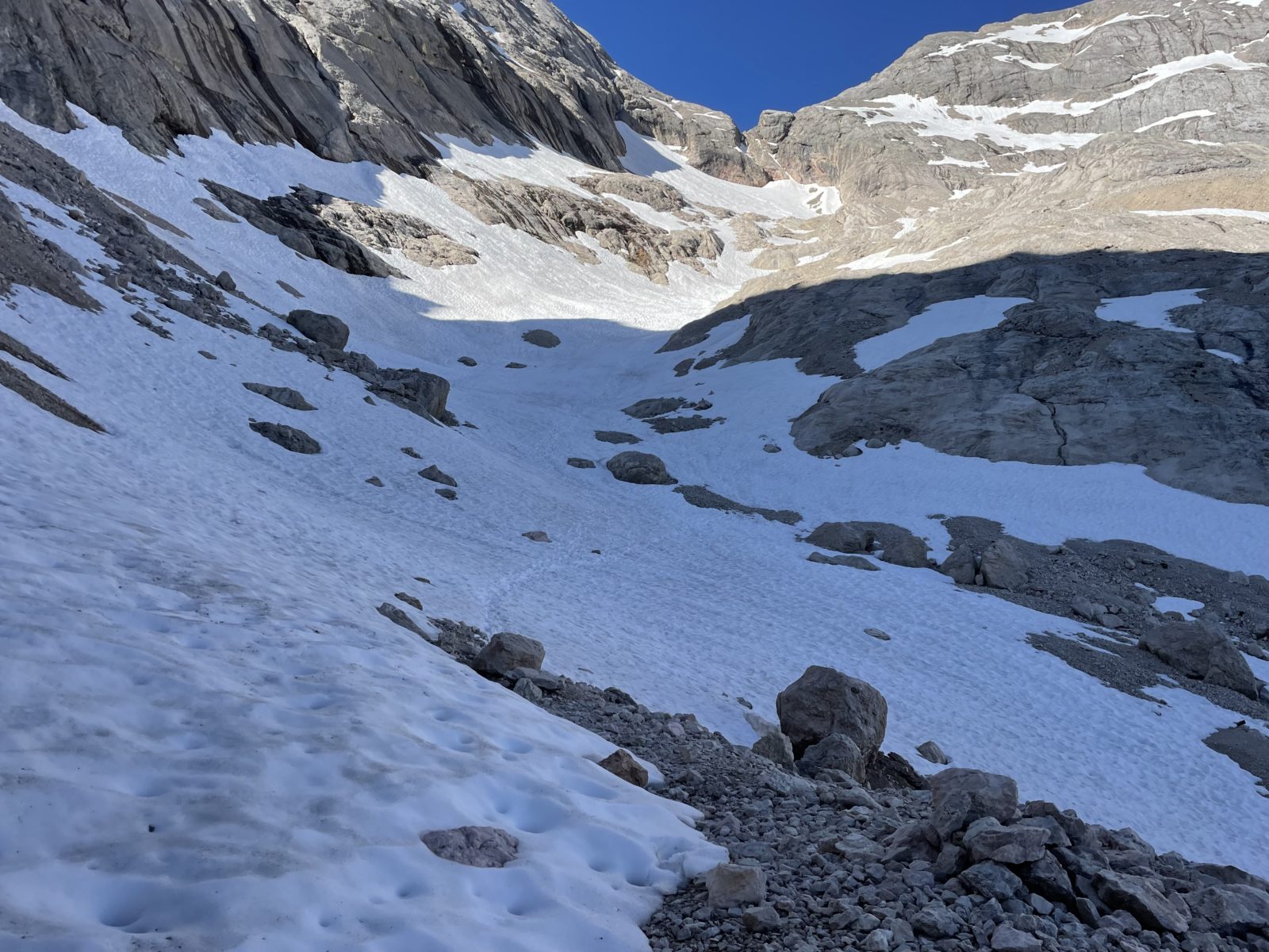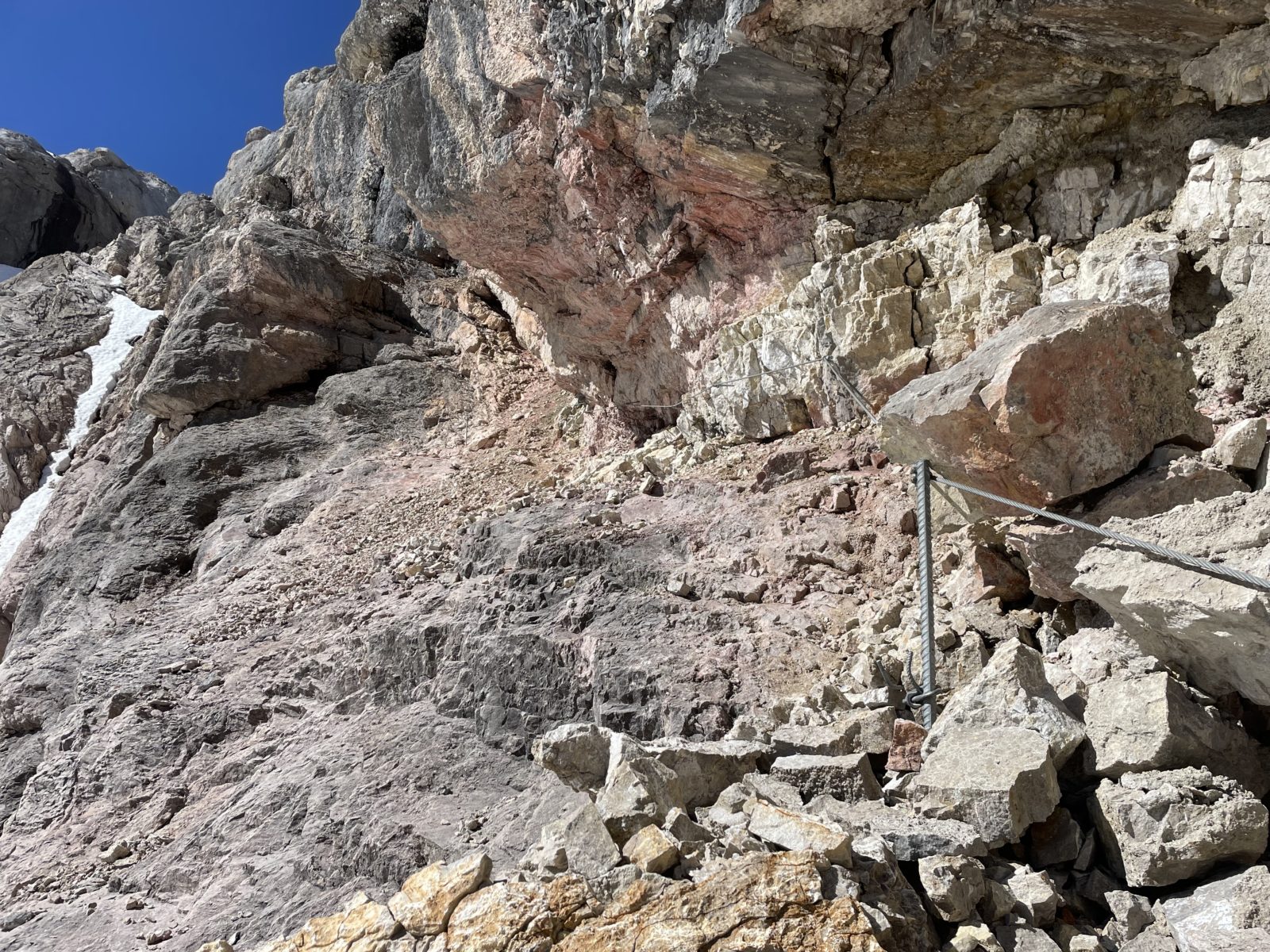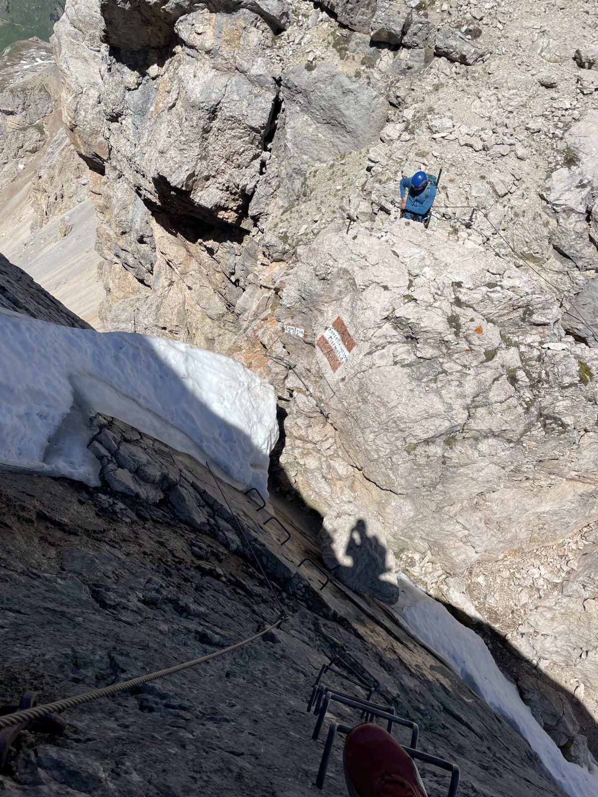 Začnu sestupovat na jih. Ferrata je krátká, je to raz dva. Ale pak následuje krátký úsek strmého tvrdého sněhu. Není to nic moc. Opatrně jdu pozpátku a stoupám do stop. Uff, je to za mnou. Následuje dost strmé suťovisko. Je to taky trochu náročné, ale to už zvládnu.