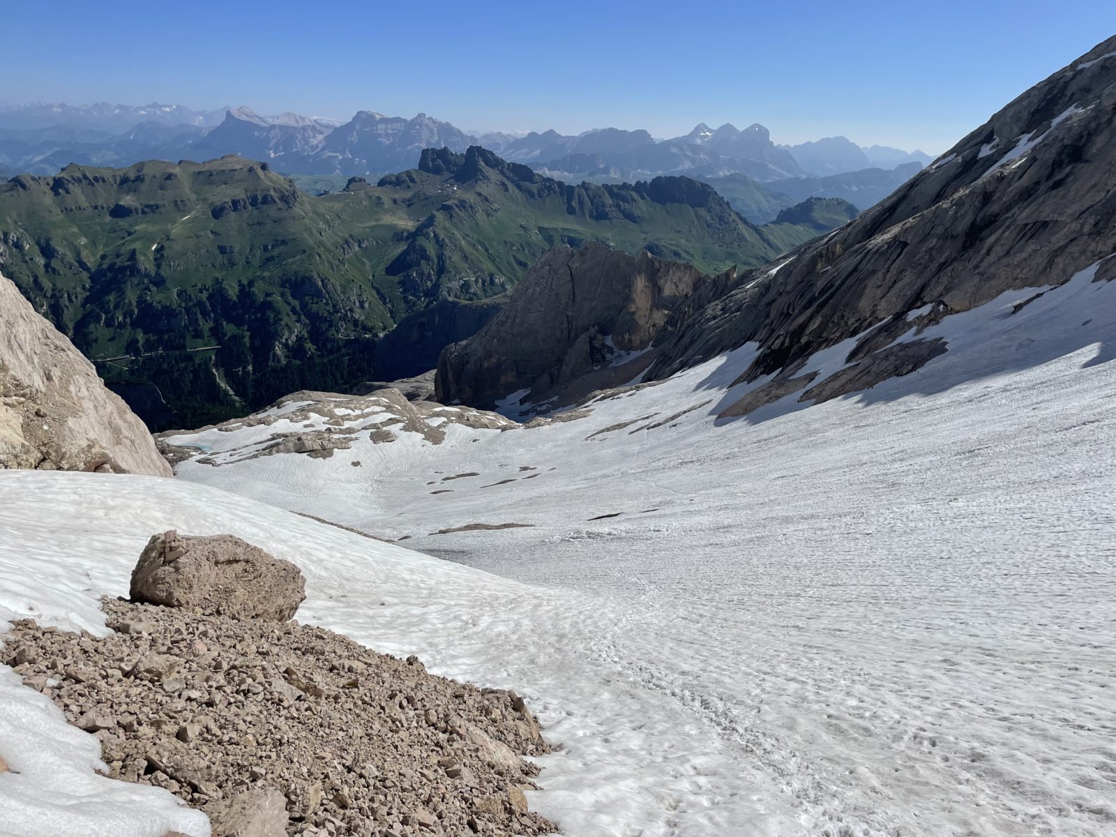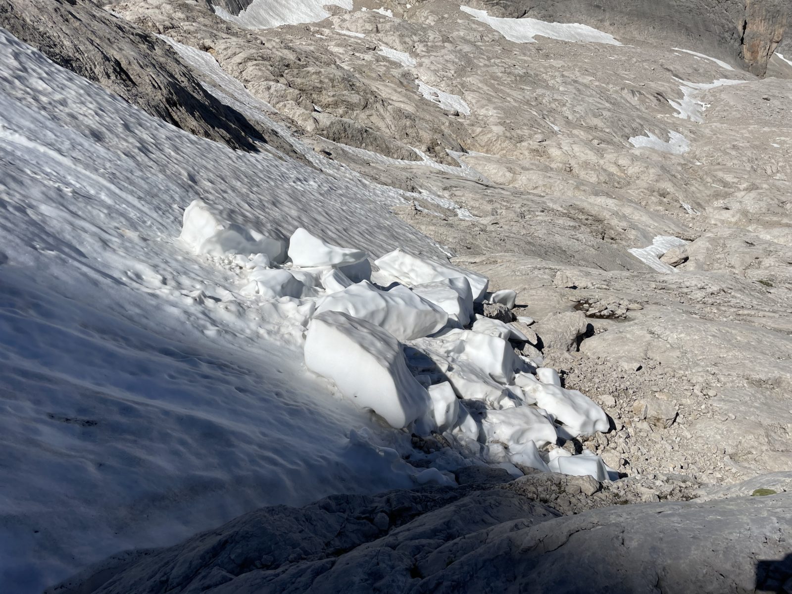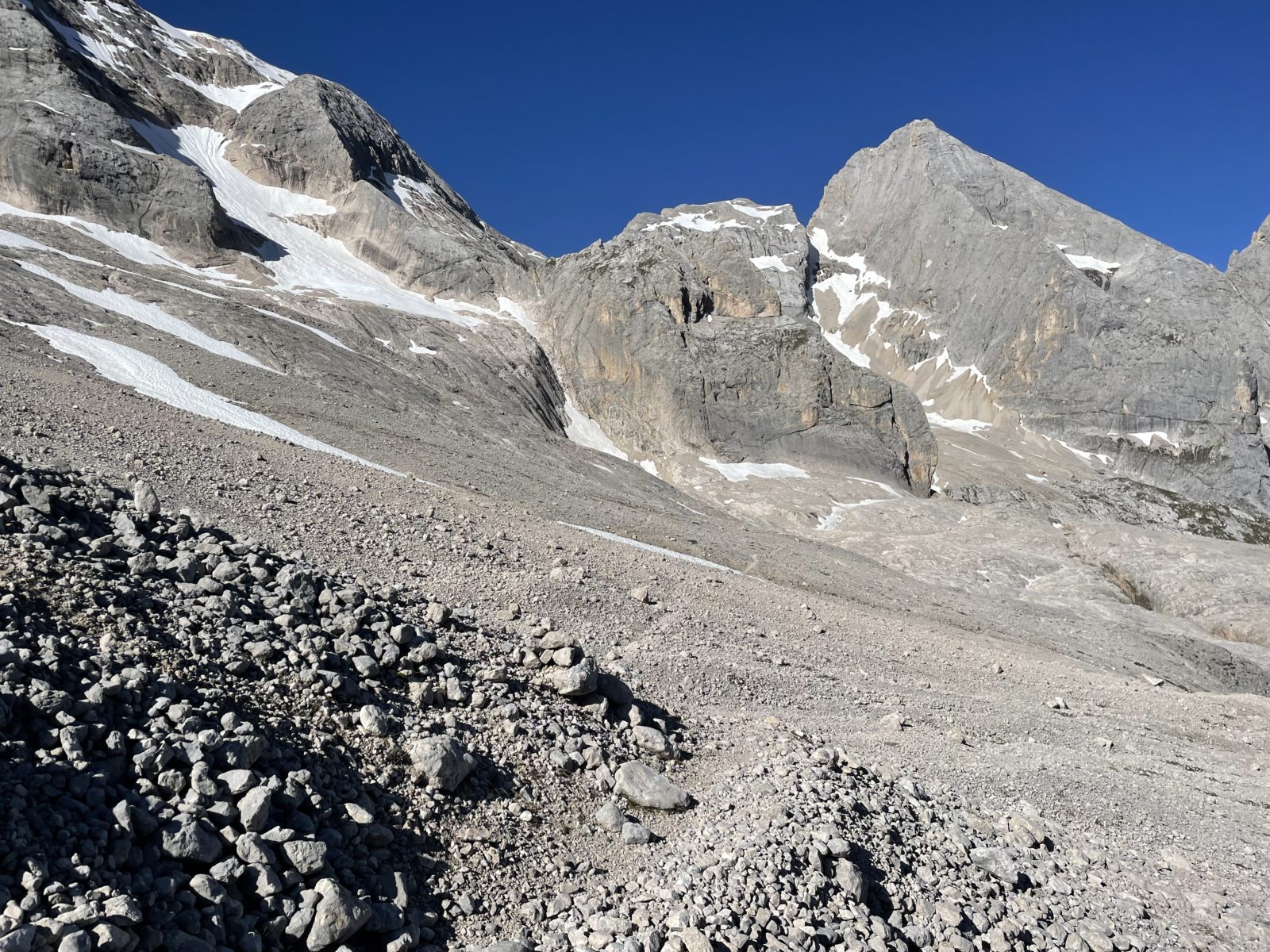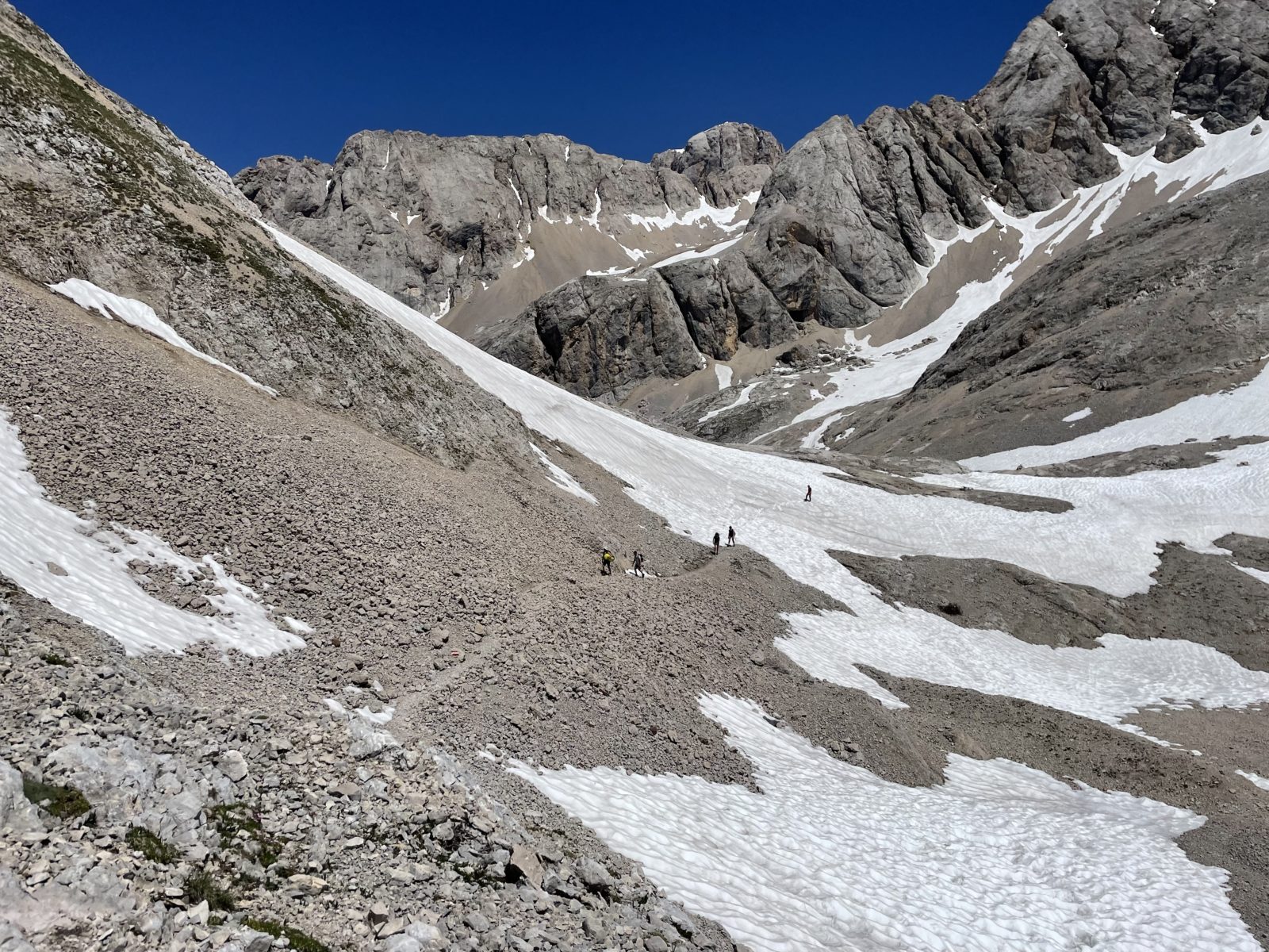 Začnu sestupovat na jih. Ferrata je krátká, je to raz dva. Ale pak následuje krátký úsek strmého tvrdého sněhu. Není to nic moc. Opatrně jdu pozpátku a stoupám do stop. Uff, je to za mnou. Následuje dost strmé suťovisko. Je to taky trochu náročné, ale to už zvládnu.