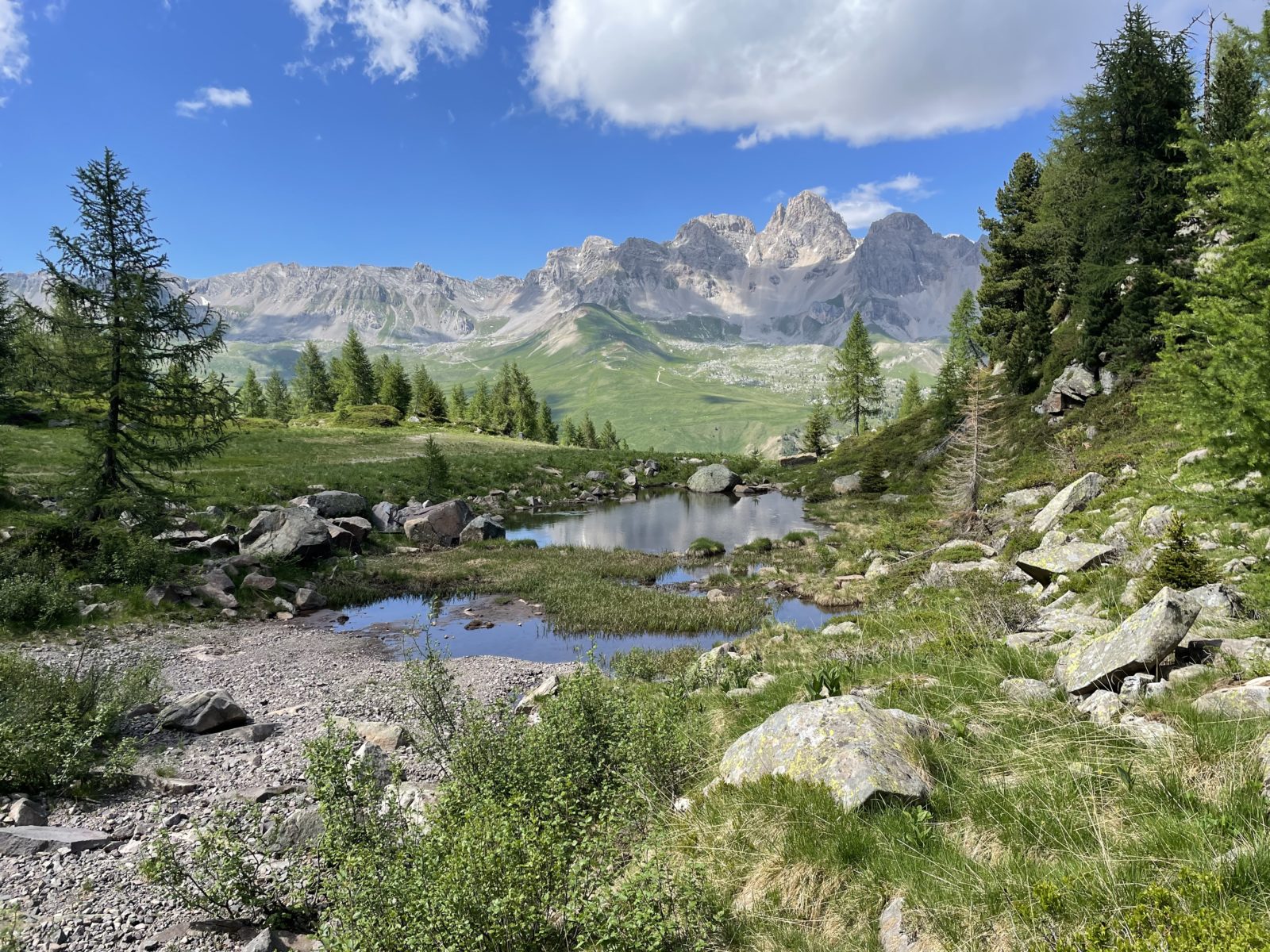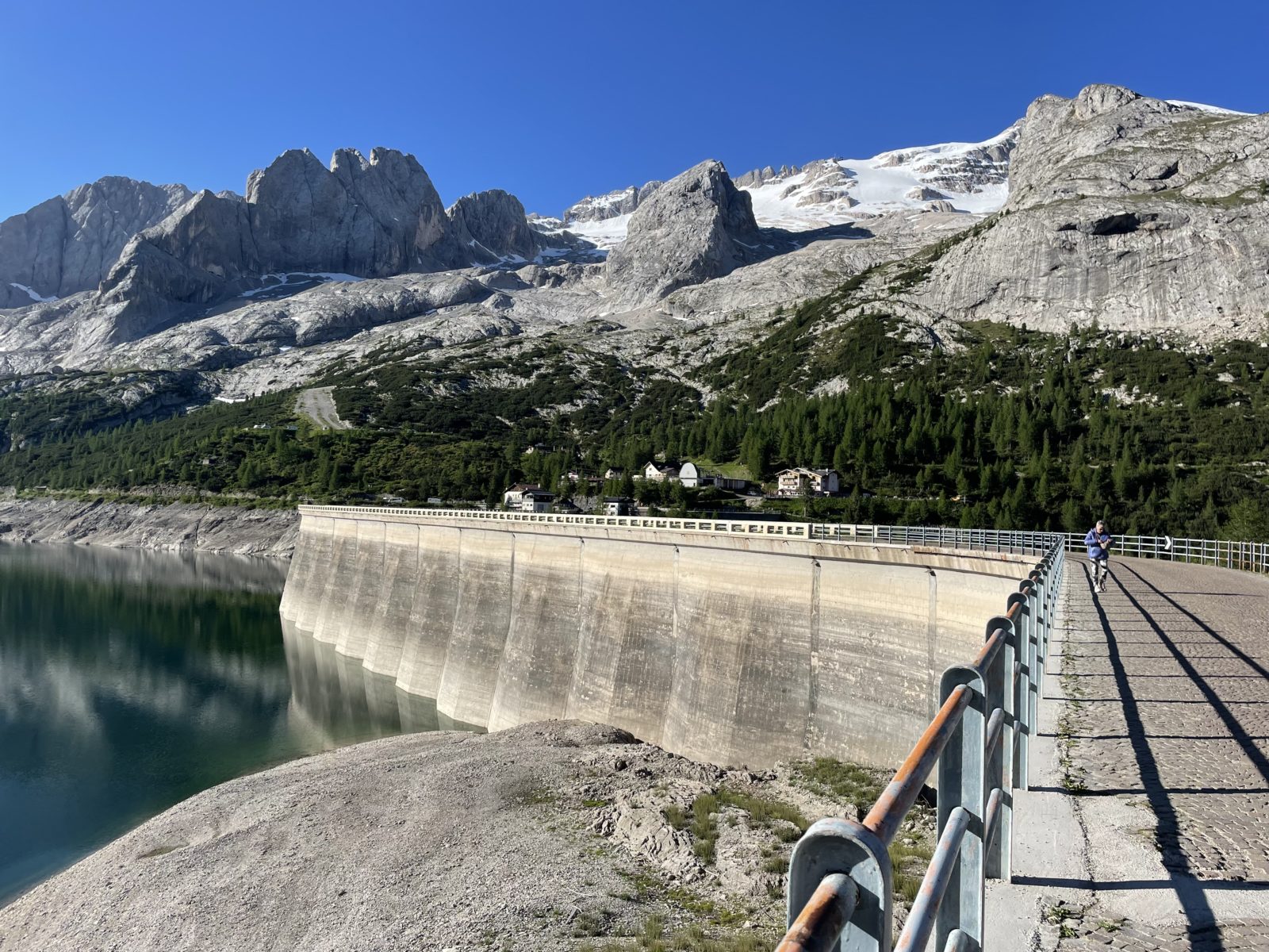 Dobaluju a v 7:54 vyrážím. Podle průvodce od Cicerone i podle 2 gpx tracků, co mám v aplikaci, bych měl jít podél přehrady a pak sejít do údolí a pak pokračovat podél nějaké silnice. Trochu nuda. Ale v mapách je vyznačené, že AV2 vede přes vysoké sedlo v masivu Marmolády. To vypadá líp! Jdu tedy tam.