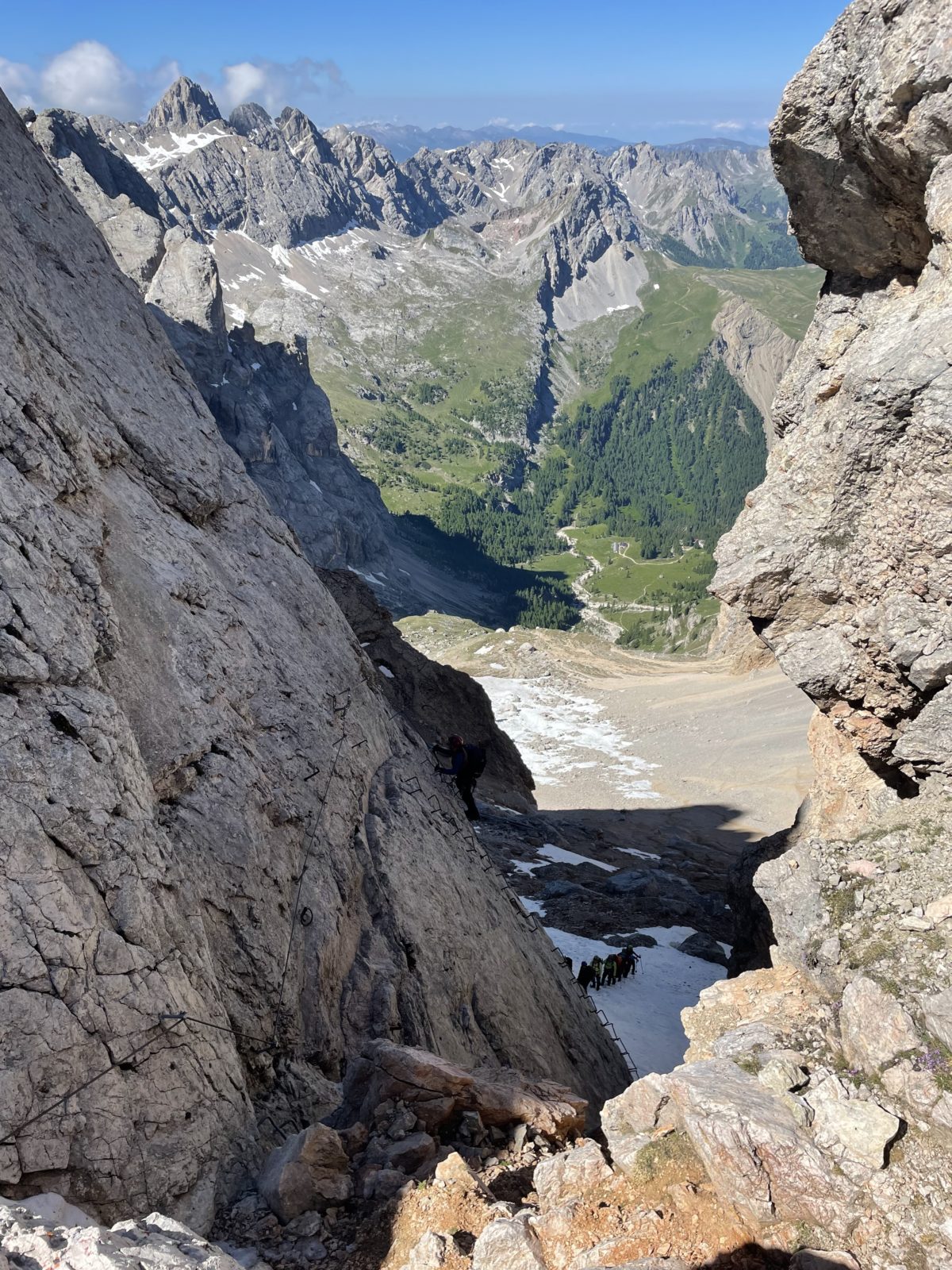 Na vrchol vede ferrata stupně obtížnosti C. To by se celkem dalo. Ale někde jsem si přečetl, že se tudy nemá chodit zpět, takže jediné po ledovci na sever, což pro mě není reálné. Chvíli to zvažuju, ale pak usoudím, že teda pokračuju dolů. Jenže z jižní strany zrovna začíná stoupat obří skupina turistů. Je jich tak 15. A jak už to bývá, jsou hrozně pomalí. Počítám, že budu čekat tak půl hodiny. No jenže když za 15 min zbývají už jen 3, tak se rozhodnu, že přece jen zkusím jít nahoru. Přispěla k tomu i informace, že skupinka se taky vrací stejnou cestou zpět.