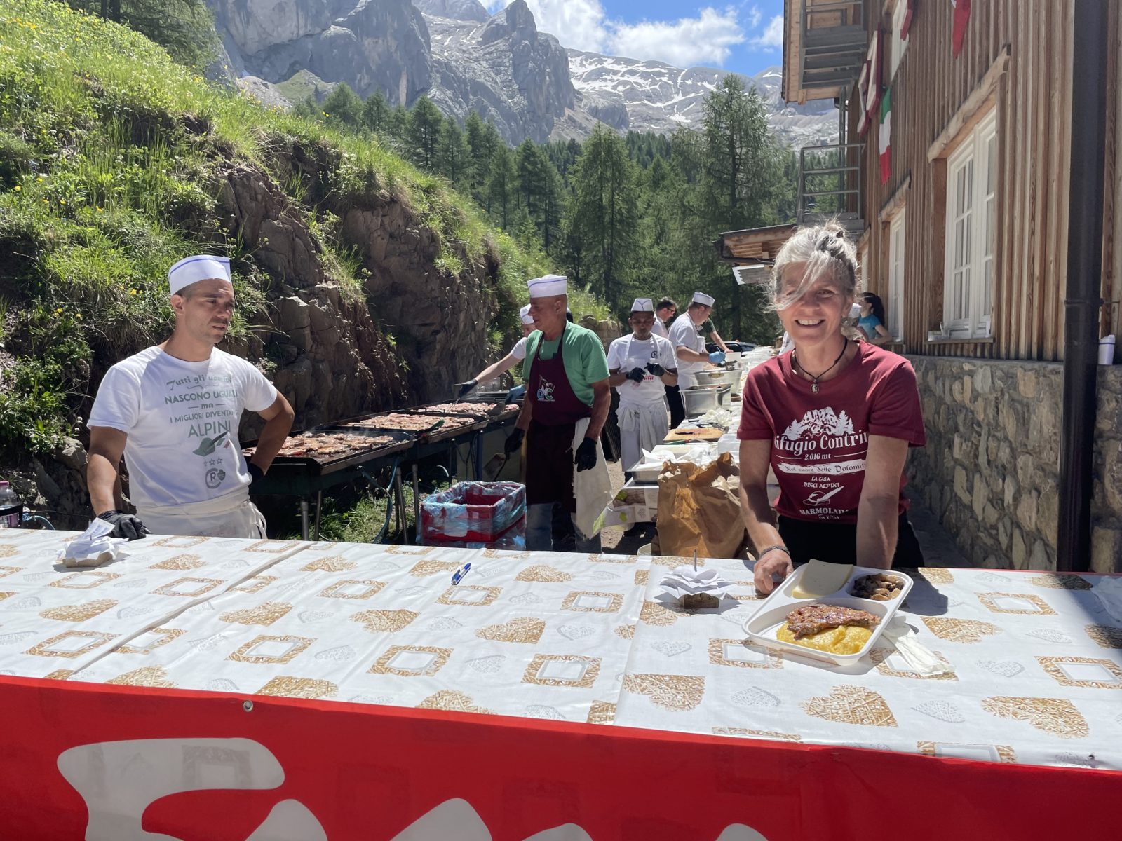 Jak klesám do údolí, tak vidím u chaty nějak hrozně moc lidí. Koná se tam nějaká katolická slavnost či co. Přicházím právě včas na oběd – je 11:50. Před chatou je stanoviště s jídlem. Kupuju plnou porci za 13 eur. To je dobrá cena! Polenta, flákota vepřového, kus sýra a nakládané houby. Taky doplňuju vodu z fontány.