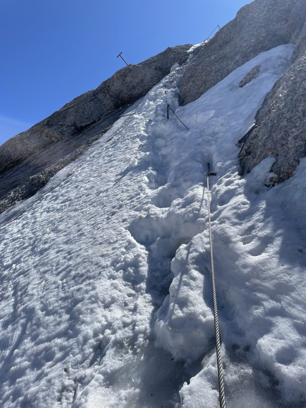 Většina skupiny už vylezla první výšvih výstupu. Dojdu je a jdu napřed. Stoupám vzhůru. Jde to dobře. Celkem makám. Až v 10:35 dojdu k místu, kde je ocelové lano na chvíli pod sněhem. Je to v takovém strmém a exponovaném místě. Musel bych udělat bez držení několik kroků v tvrdém sněhu. Nelíbí se mi to. Nemám žádné vybavení. Takže tady končím. Jsem ve výšce asi 3100 m. Nevadí, aspoň jsem to zkusil.
