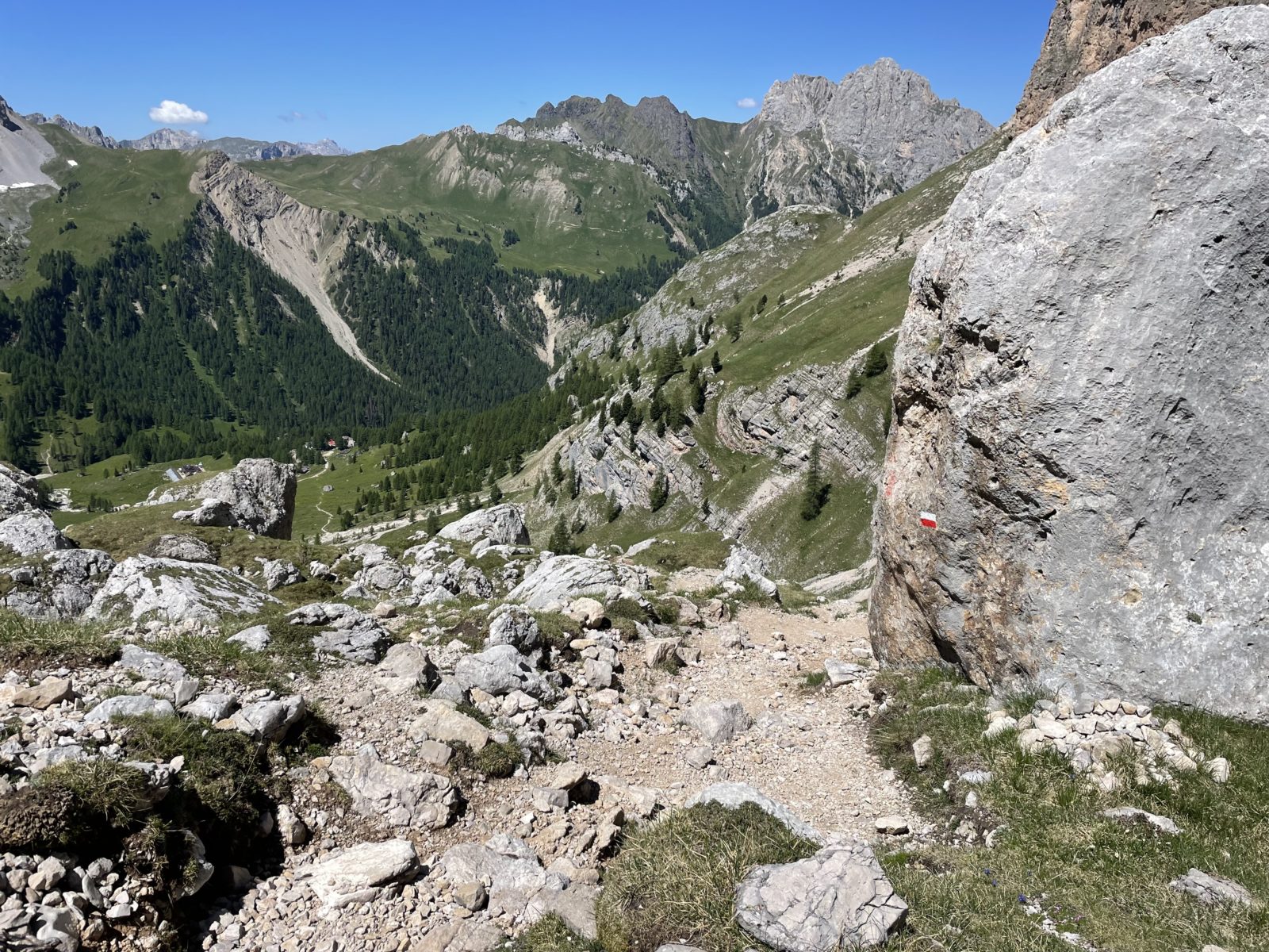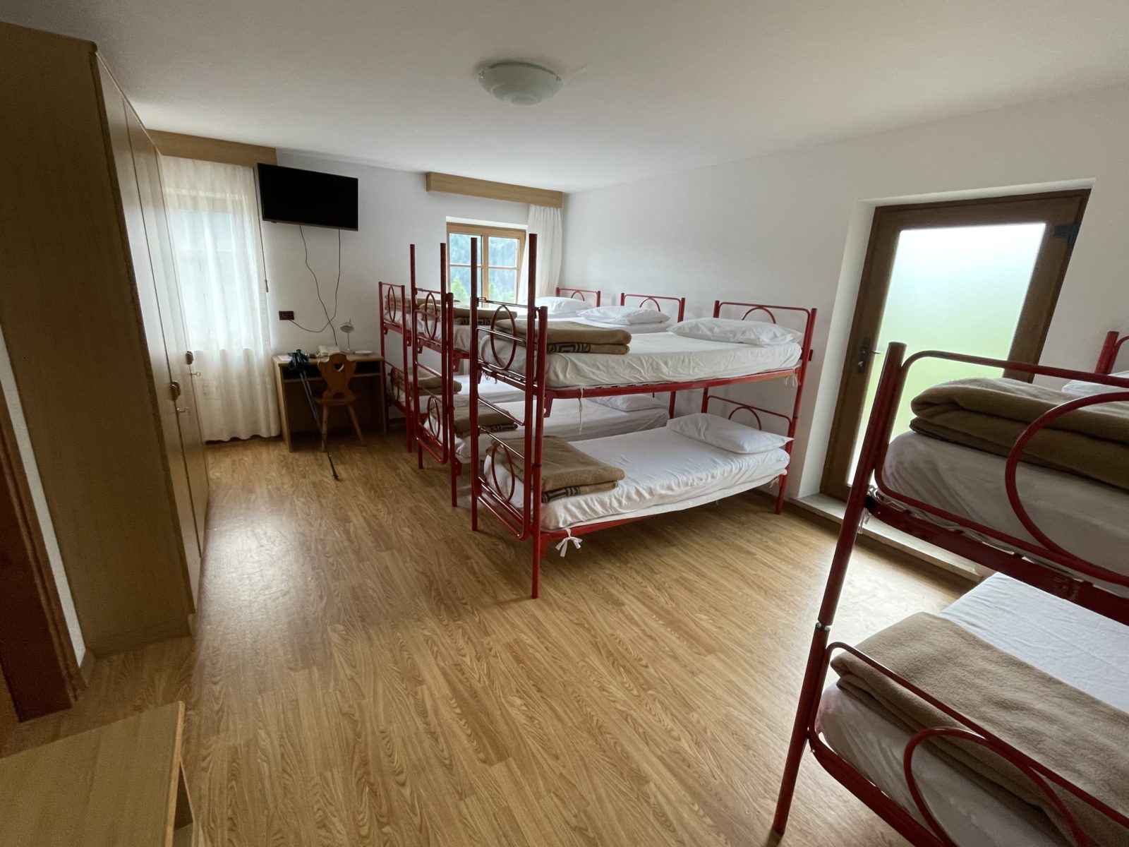 Pak dojdu do sedýlka a pak už je to jen 2 km dolů k sedlu Passo Valles, kde je i stejnojmenná chata. Jsem tu v 16:48. Prve jsem myslel, že bych mohl jít ještě na další chatu, trvalo by to tak 2 hodiny. Ale nakonec se jdu zeptat, jestli mají volnou postel tu. Mají. A je to tu sympatické. Budu v pokoji s palandama asi sám. A polopenze stojí jen 43!