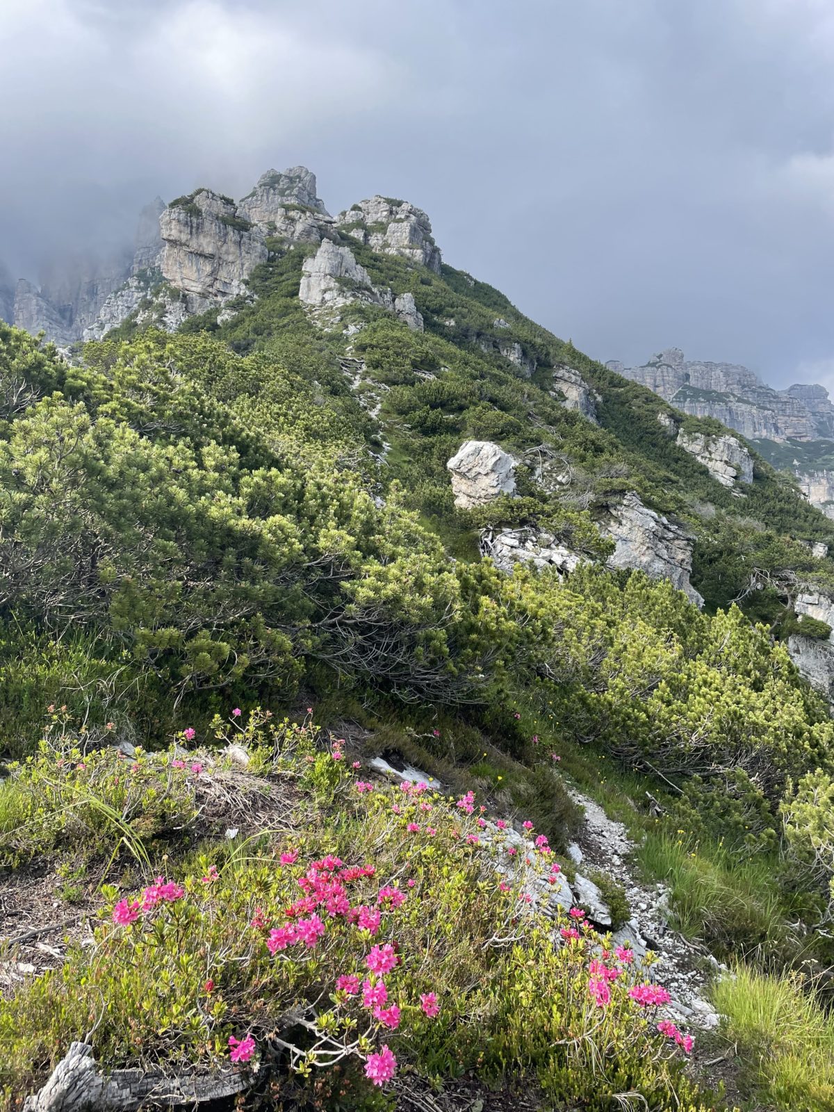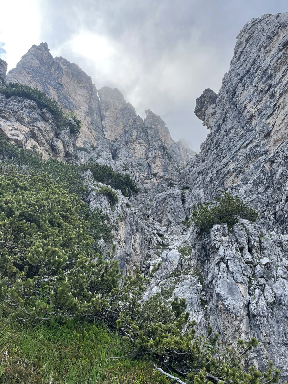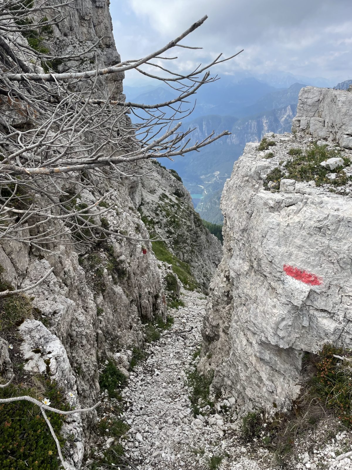 Na konci traverzu následuje mega strmé škrábání se do vrchu. Včetně úseku s ocelovým lanem.