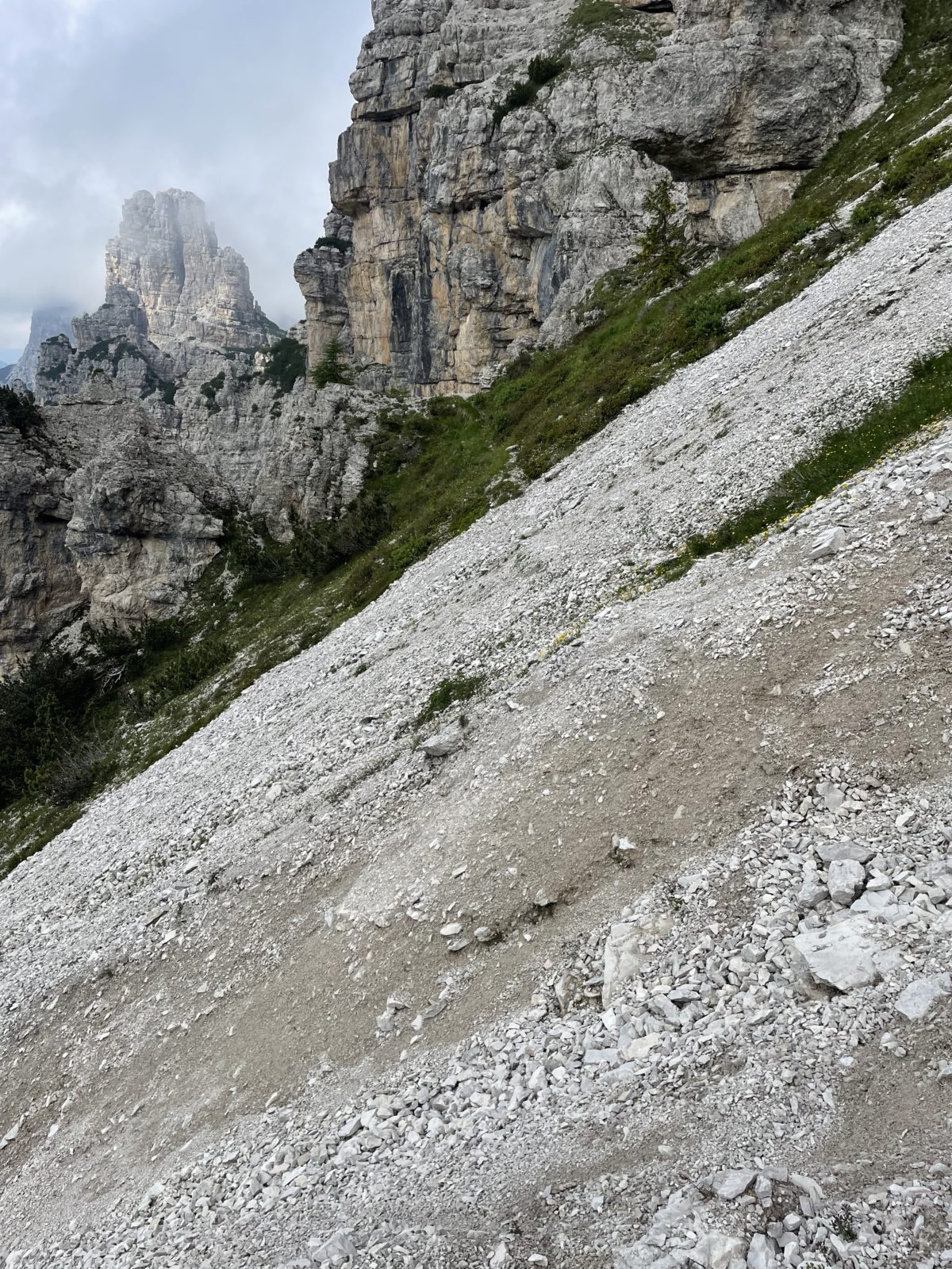 V 16:23 dojdu do sedýlka a teď přijde další brutální pasáž. Travers v suťovisku. Je to strmé a cesta dohromady žádná. A k tomu úseky, kdy se leze nahoru nebo dolů. Nevěděl jsem, že něco tak strmého je vůbec choditelné. Člověk se pořád učí.