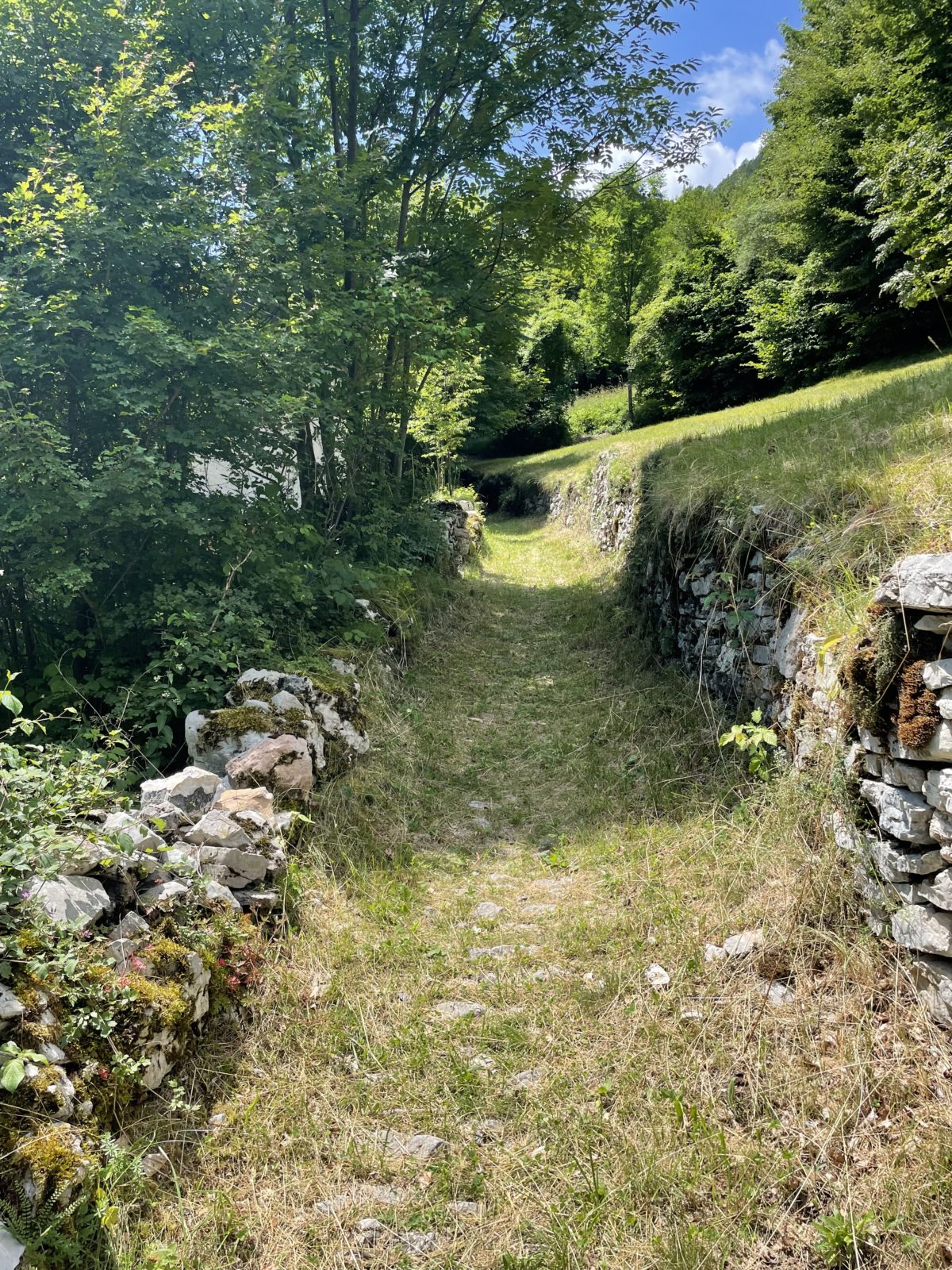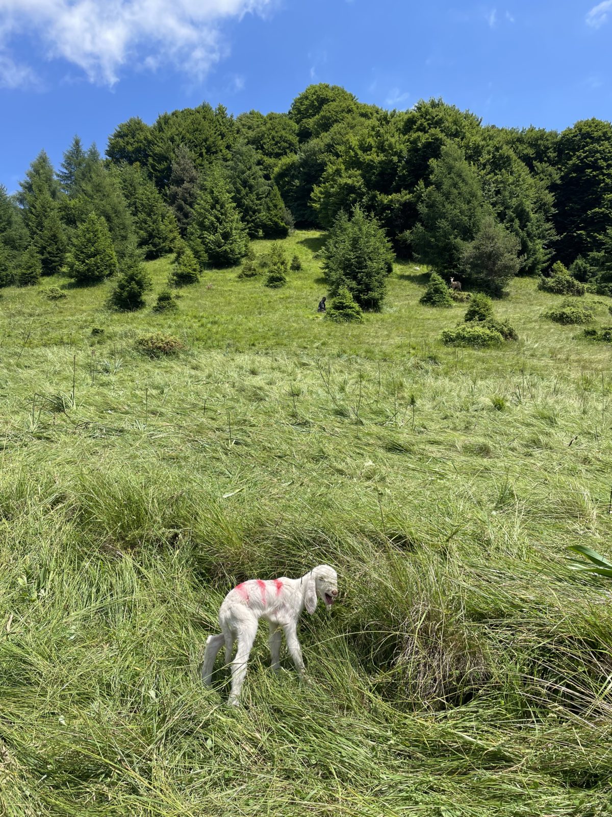 Objevuje se i pastvina a střídá se s lesními úseky. Potkávám velmi mladá jehňátka a pastevce. Cesta začíná být dost zarostlá, postup je pomalý.