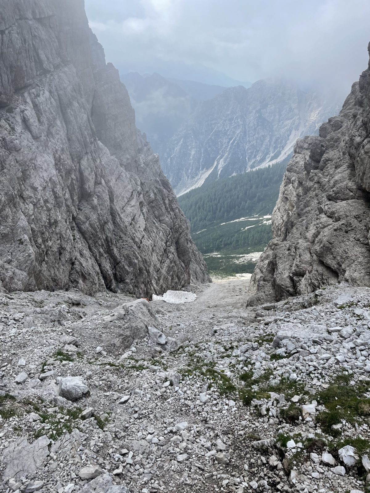 Teď už jen sejít asi 600 nebo 700 m k chatě. Zadarmo to nebude. Je to hodně strmé suťovisko. V první části mi nezbyde než se klouzat sutí dolů. Je to nejefektivnější, ale moc to nemám rád, protože do tenisek se hned dostanou kamínky.