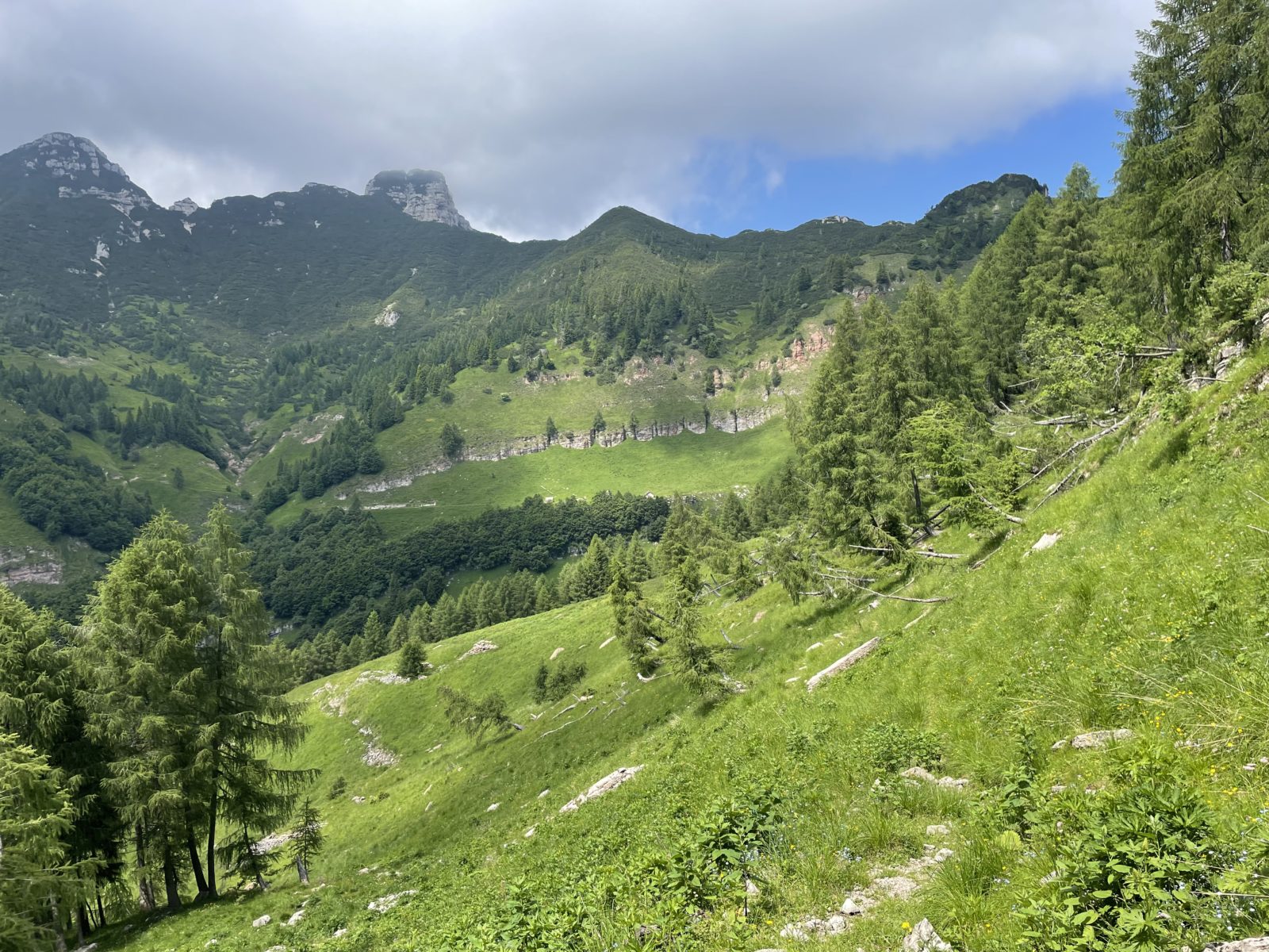 Takže si dám pořádnou sváču a v 15:40 pokračuju dál. Cesta je pořád hodně zarostlá. Prve je to taková pastvina, čím dál strmější, a pak začíná kleč a to je ještě strmější. Je to celkem brutál.