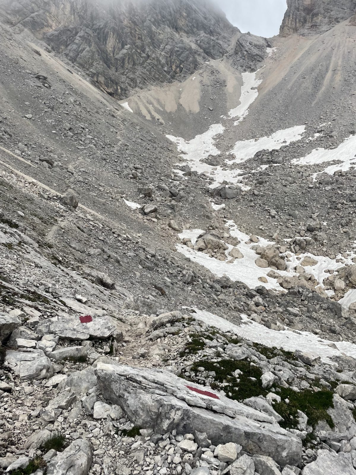 No ale cestička to teda není nic moc, není o mnoho lepší než včerejší stezky. V lese se místy trochu ztrácí. Sejde prudce dolů až ven z lesa na takové rovné suťovisko. Přes to se přejde a pak zase prudce nahoru.