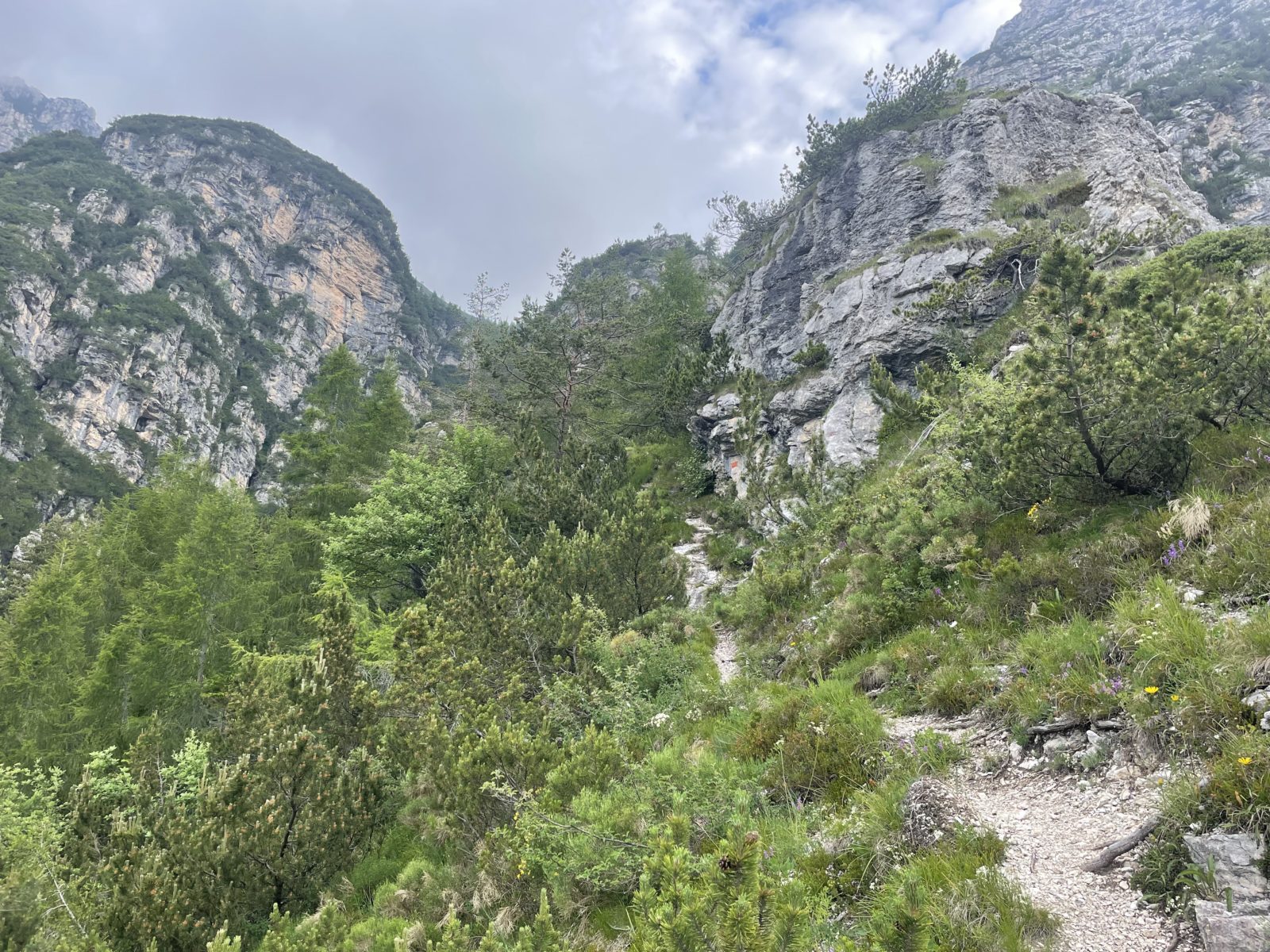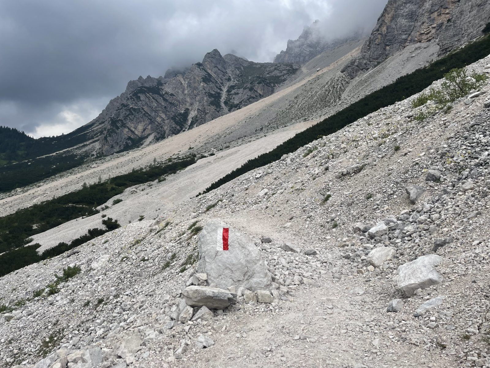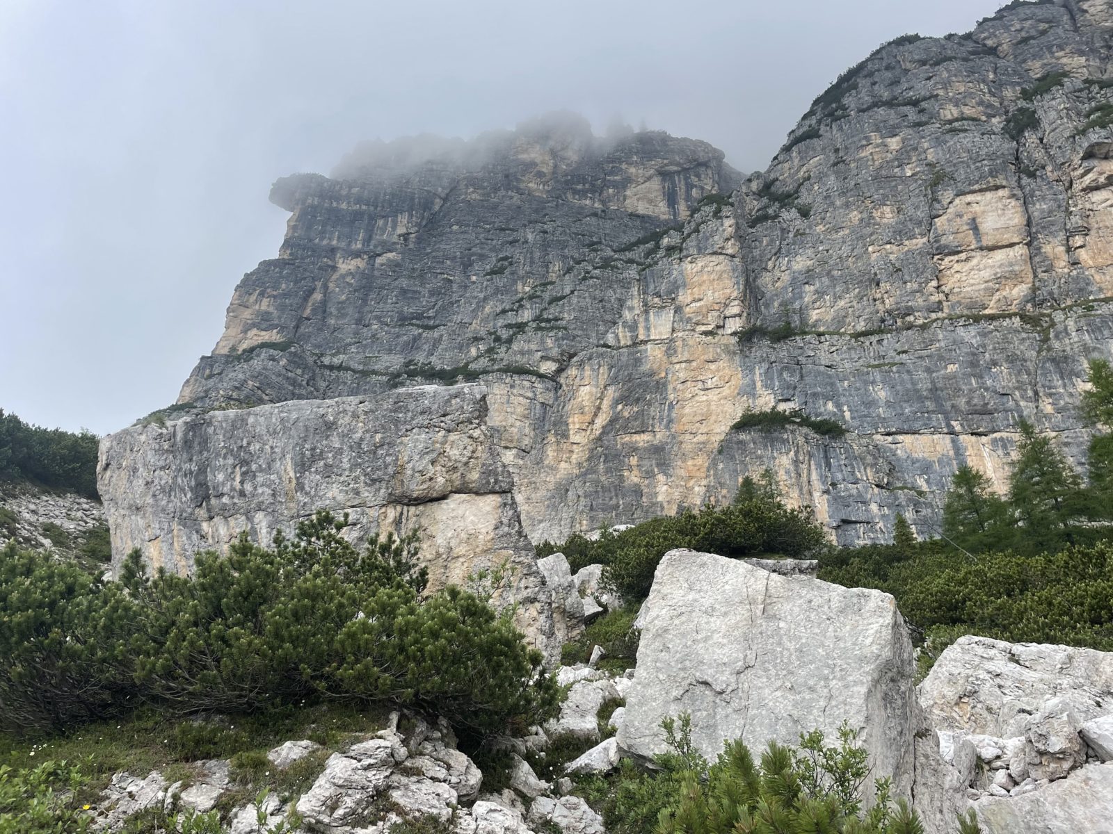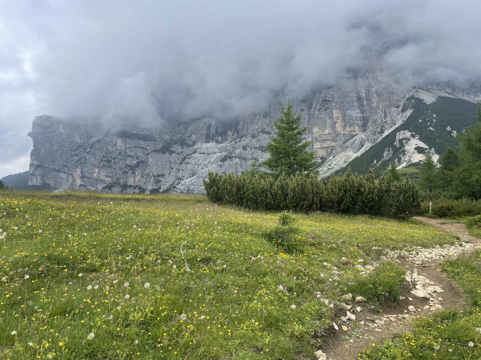 Přemýšlím, co dál. Je 14:16. Pochopitelně skončit je brzo. No ale přede mnou stojí krásná hora v mracích – Monte Pelmo (3172 m). A když budu pokračovat po stezce dál, tak si tu horu vůbec neužiju a půjdu rovnou do údolí. To mi přijde škoda. Nejraději bych si vylezl nahoru, ale když je vrchol v mraku, tak to asi nemá cenu. Tak bych si to mohl aspoň obejít dokola a skončit tady v té chatě poblíž. Je to tak 15 km a nejmíň 800 m stoupání. To nevím, jestli není na dnešek už příliš. Pak zjistím, že po 9 km a 250 m stoupání je další chata. Tak to by šlo! Jdu tedy na to!