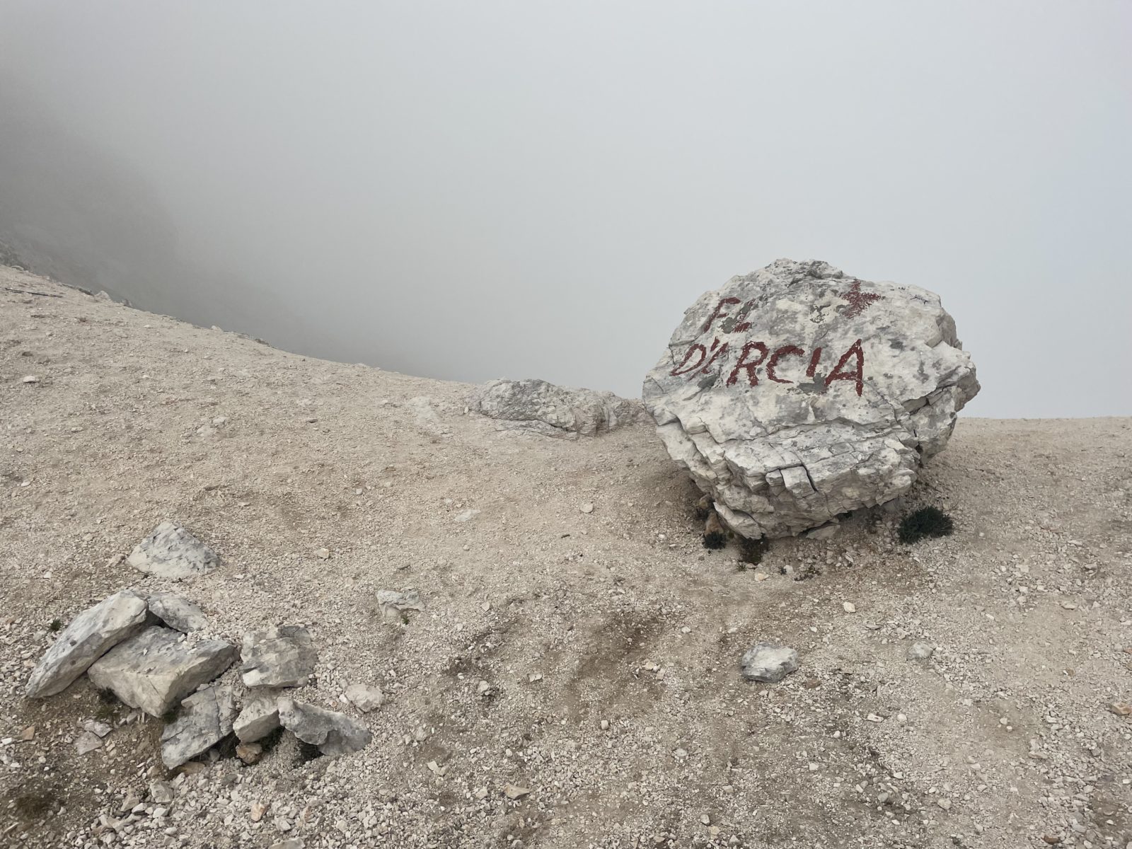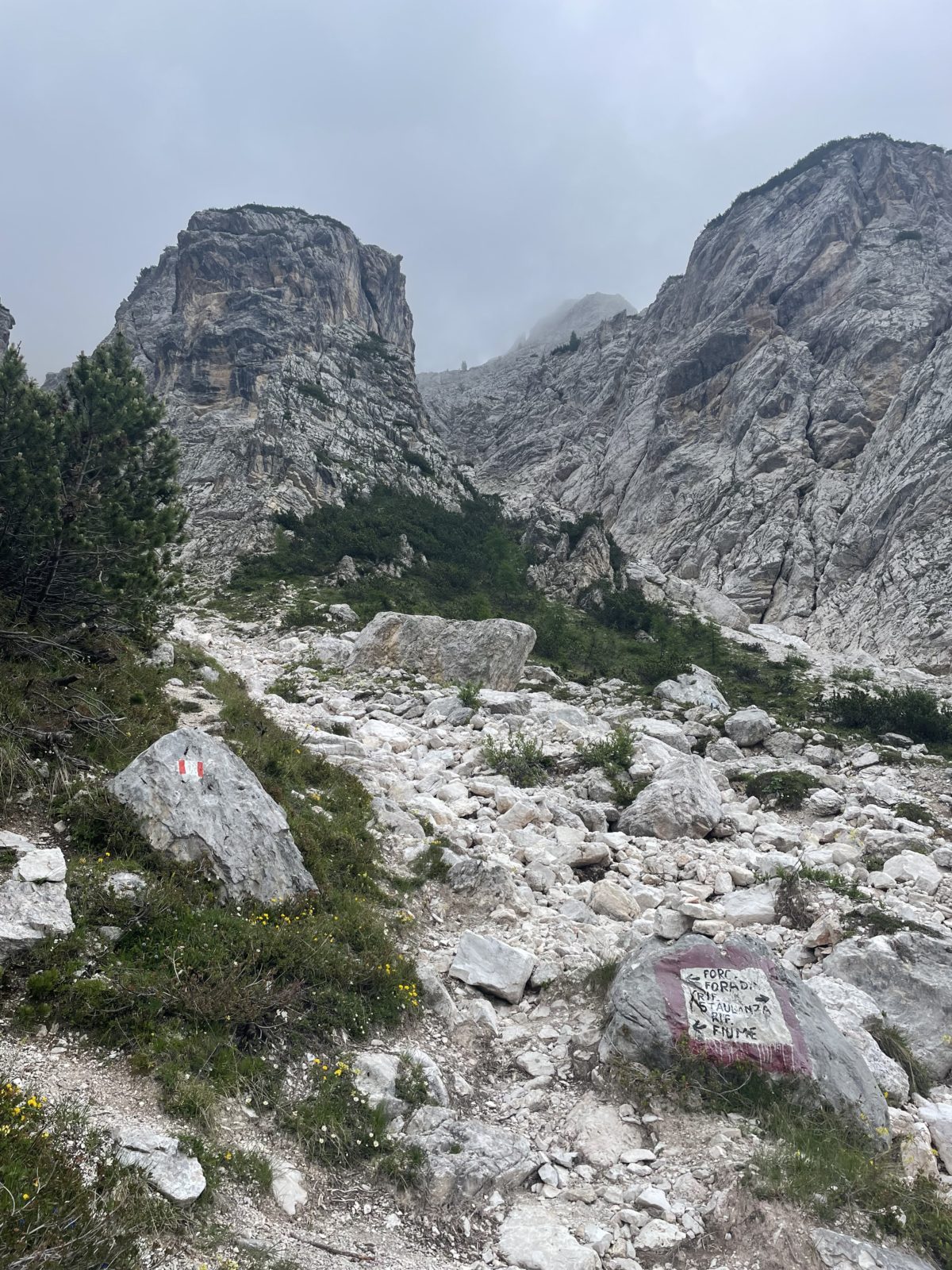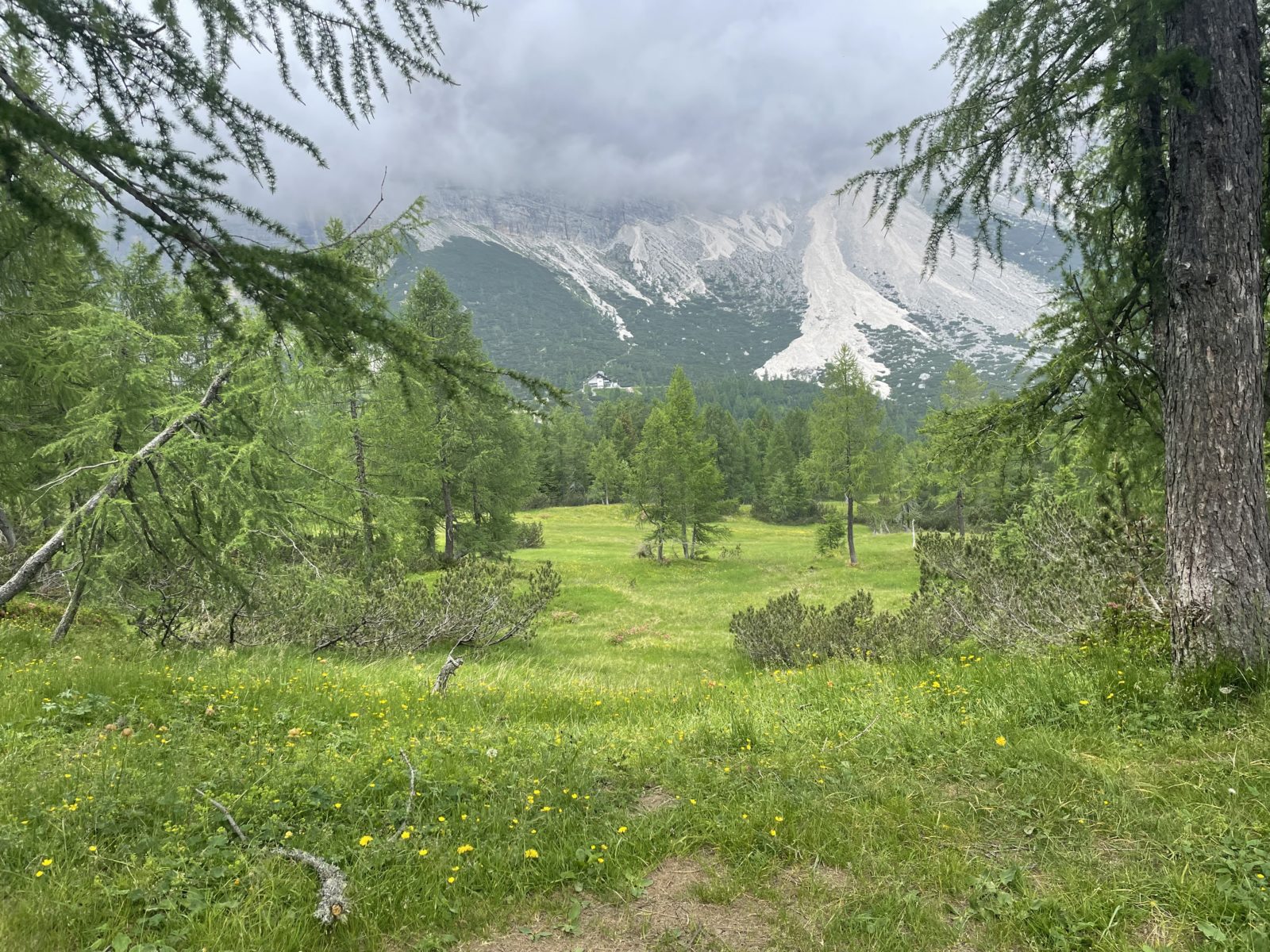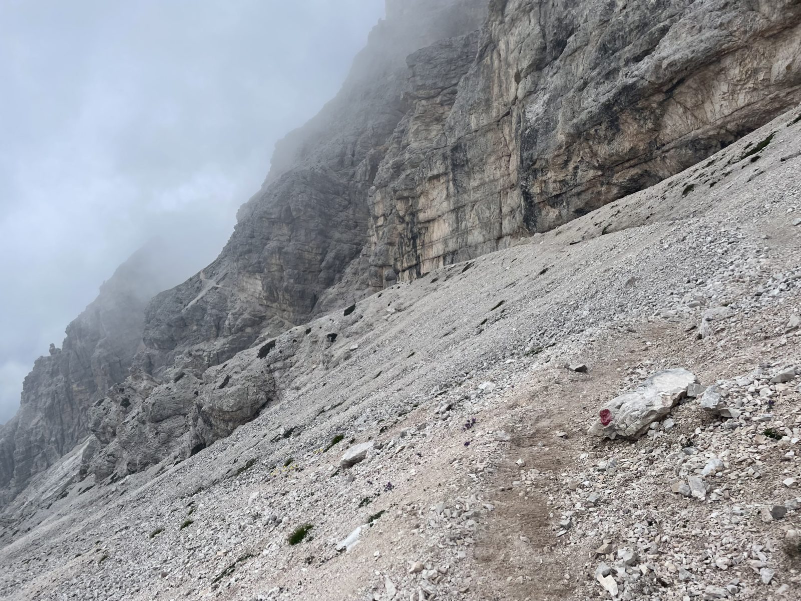 Přemýšlím, co dál. Je 14:16. Pochopitelně skončit je brzo. No ale přede mnou stojí krásná hora v mracích – Monte Pelmo (3172 m). A když budu pokračovat po stezce dál, tak si tu horu vůbec neužiju a půjdu rovnou do údolí. To mi přijde škoda. Nejraději bych si vylezl nahoru, ale když je vrchol v mraku, tak to asi nemá cenu. Tak bych si to mohl aspoň obejít dokola a skončit tady v té chatě poblíž. Je to tak 15 km a nejmíň 800 m stoupání. To nevím, jestli není na dnešek už příliš. Pak zjistím, že po 9 km a 250 m stoupání je další chata. Tak to by šlo! Jdu tedy na to!