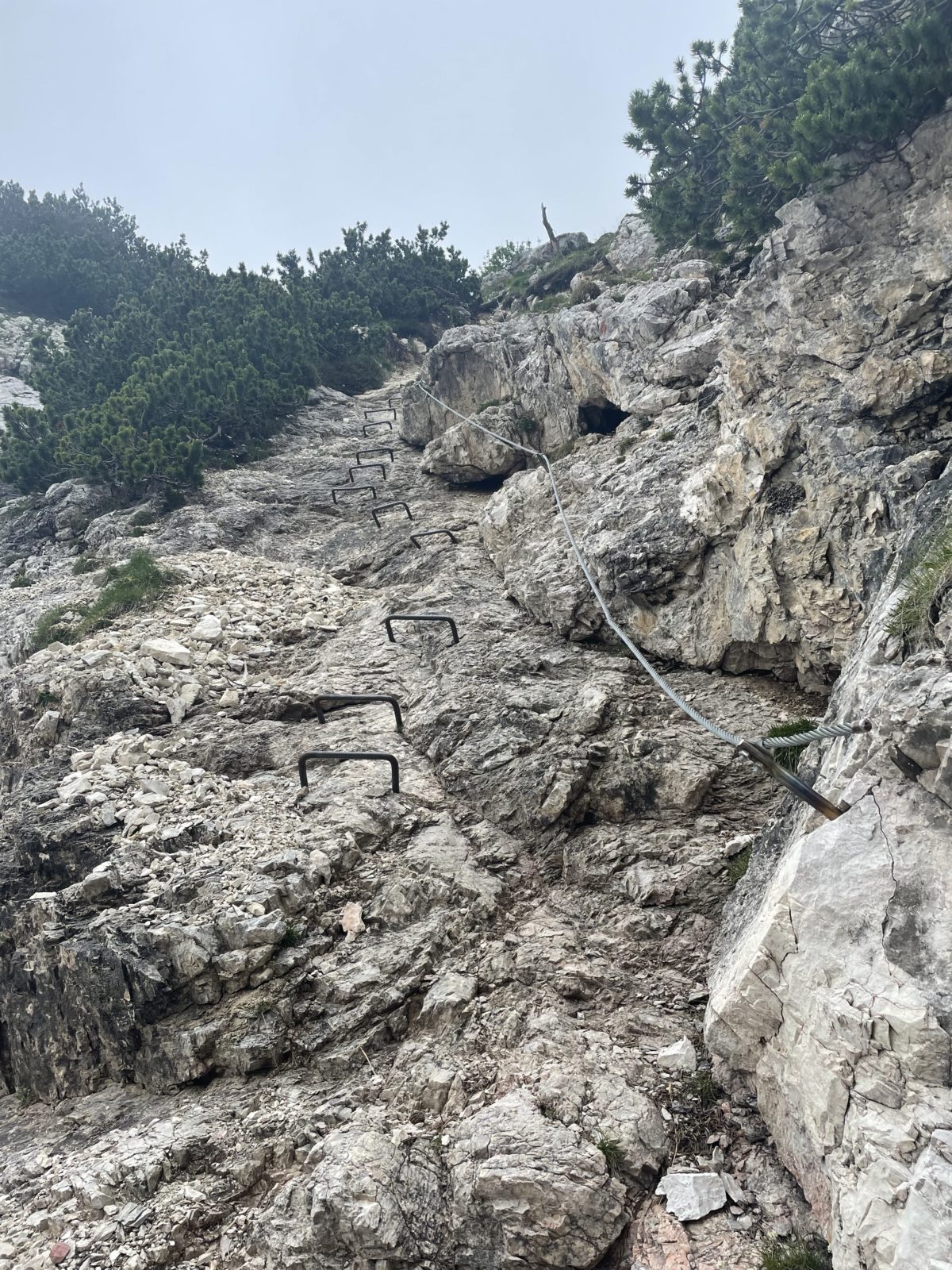 Zadarmo ten sestup není. Prve je dost strmý. A pak následuje traverz do boku, místy zajištěný lanem a i trochu do kopce.
