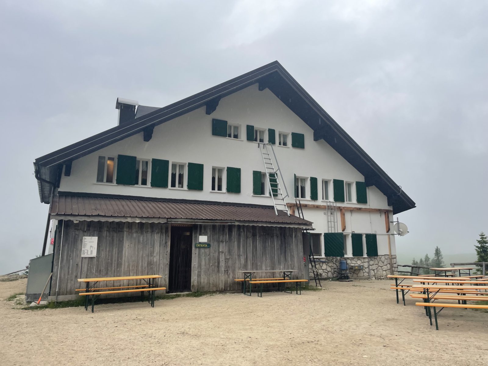 K chatě dojdu v 16:43. Je celkem malá a pohybuje se tu dost lidí. Zeptám se na místo… a mají plno! To se mi stalo na tomto výletě poprvé. Takže co se dá dělat, dokončím ten okruh, jak jsem původně zamýšlel. Kupuju 0,5 l vody a svačím chipsy. Pár minut před 17. hodinou jdu na to. Čeká mě 550 m nahoru do sedla a to samé pak dolů. To celé zhruba na 5 km. Mraky se různě honí. Bude pršet? Zatím ne.