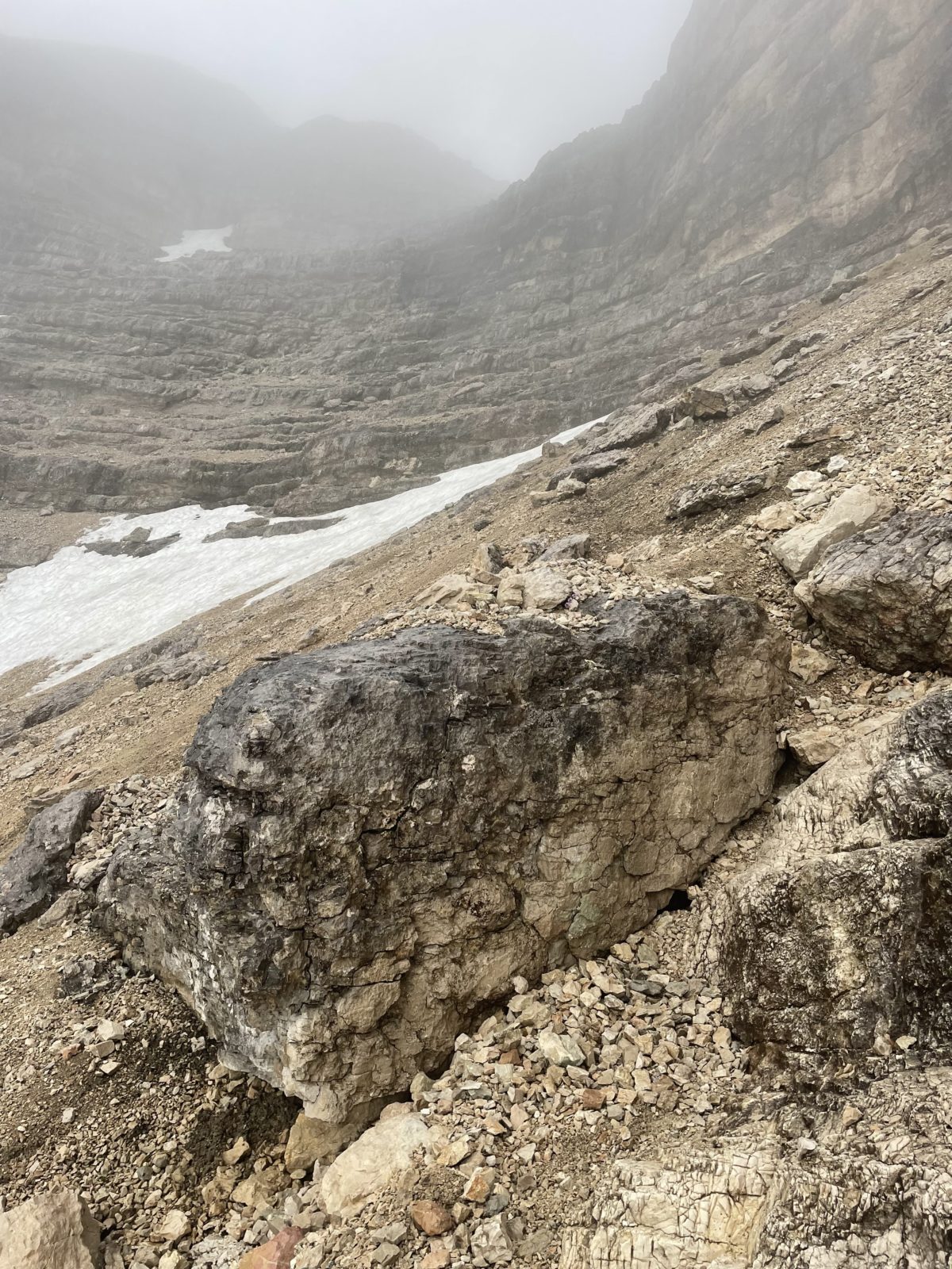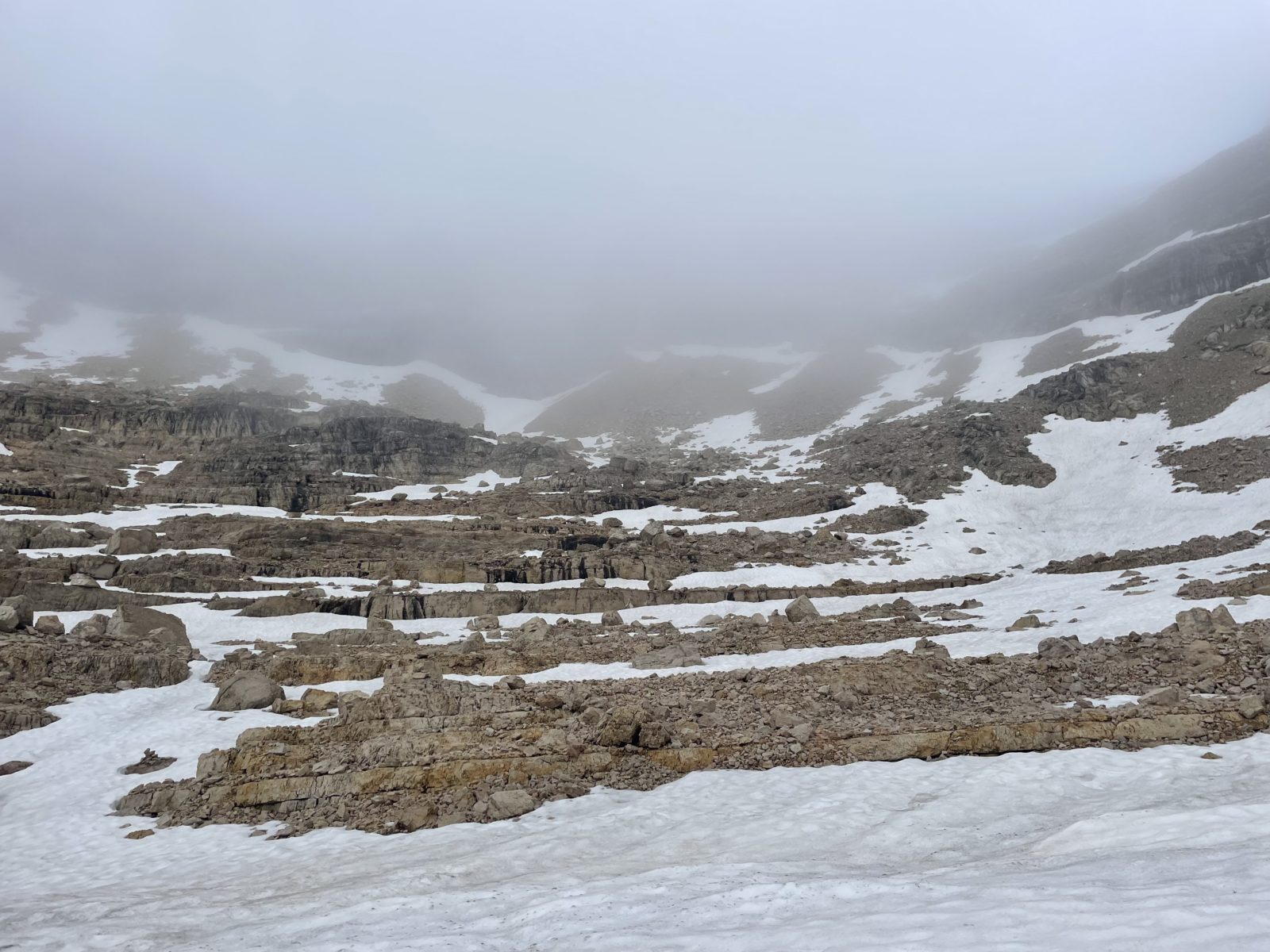 Jsem ve výšce skoro 3000 m. Zbývá mi 200 m na vrchol. Kousek nade mnou začíná mrak. Nevypadá to, že by se to mělo odkrýt. A sice mi teď není zima, ale další oblečení už nemám a kdyby začlo víc foukat a třeba i pršet, tak mi už bude zima. Rozhoduju se, že jsem si užil zábavy dost a otáčím to. Jasně, vrchol by byl fajn, i bez výhledů. Ale nemusím mít všechno a i tak mě ještě čeká dlouhá cesta dolů.