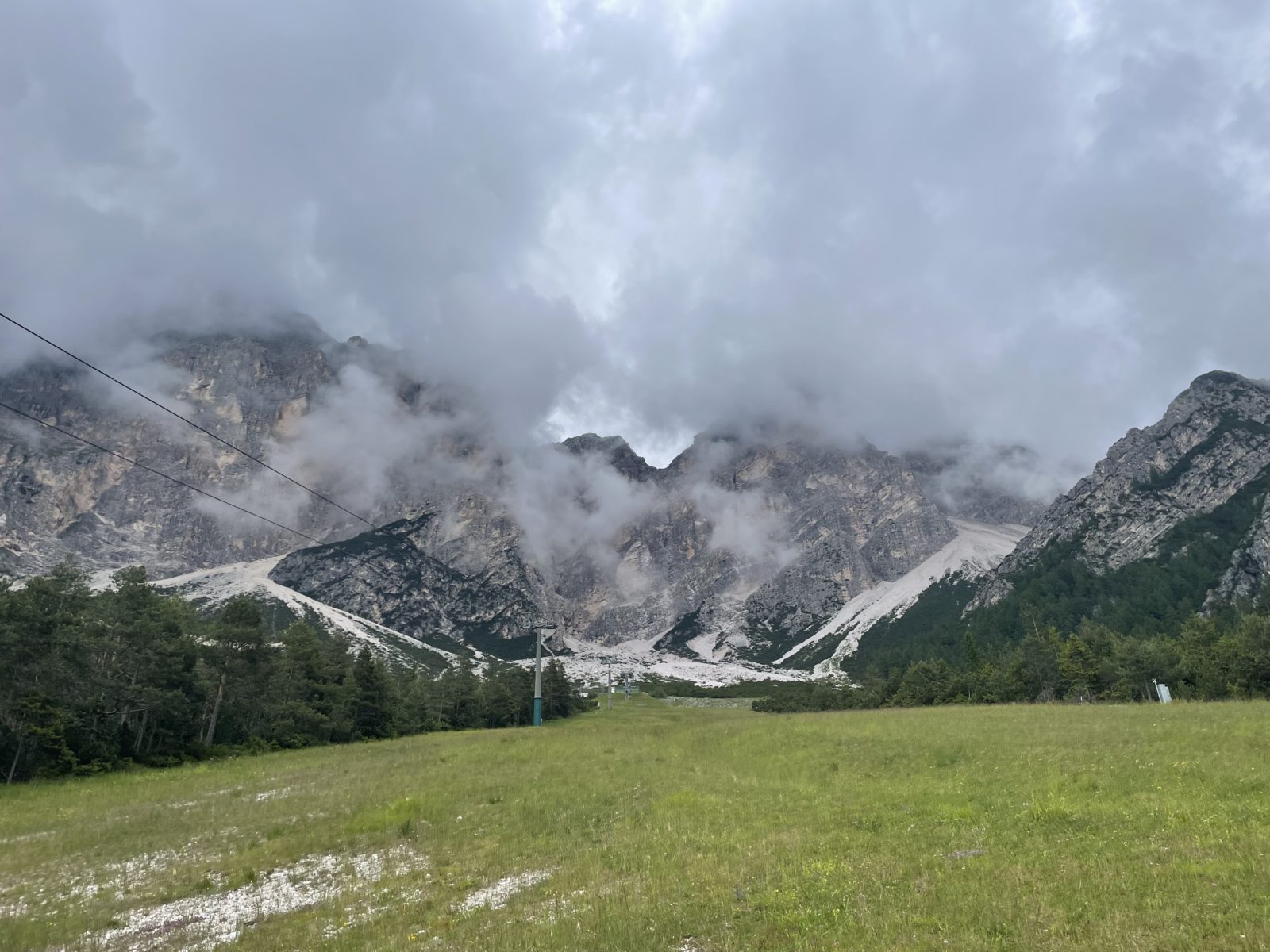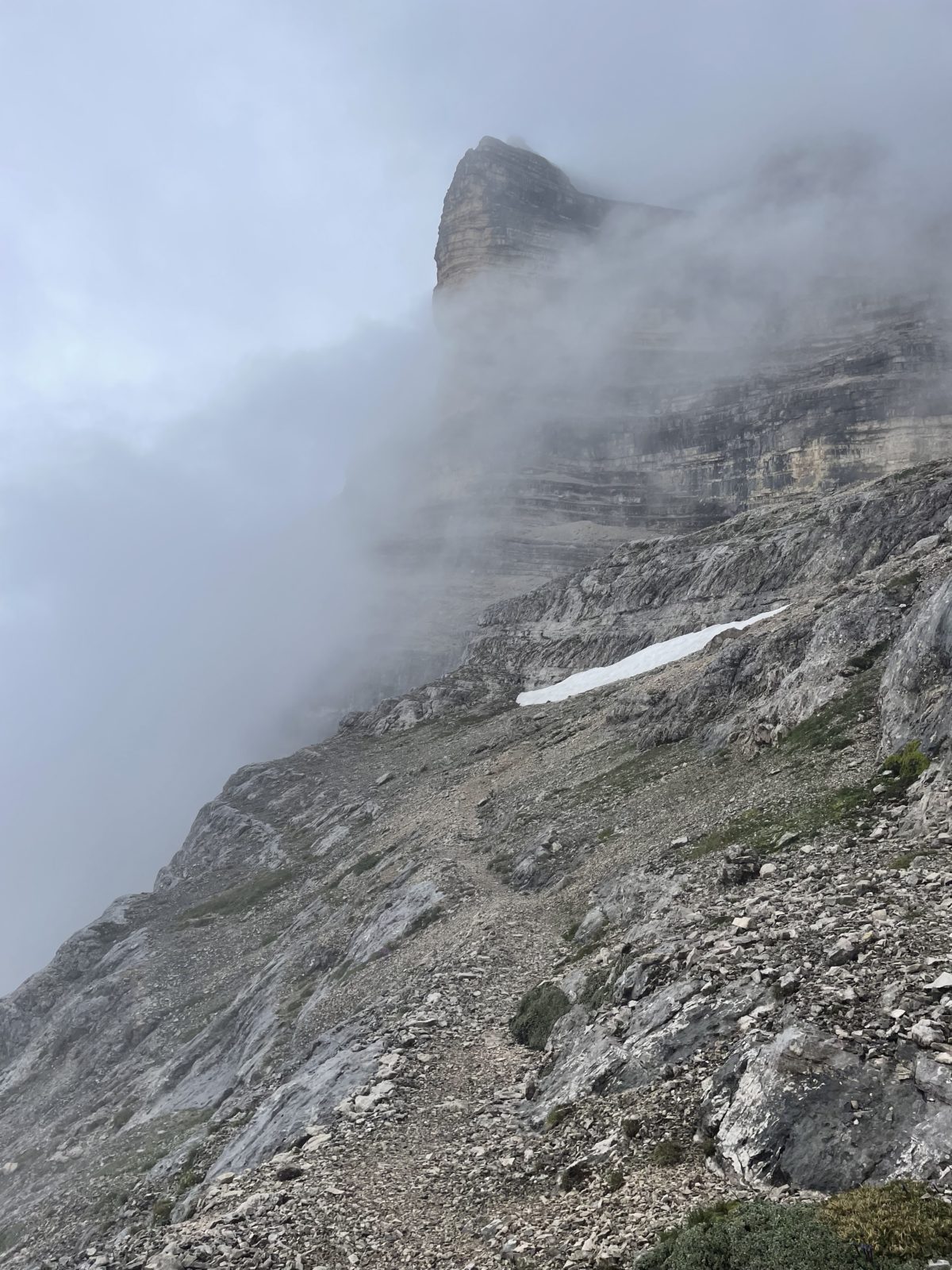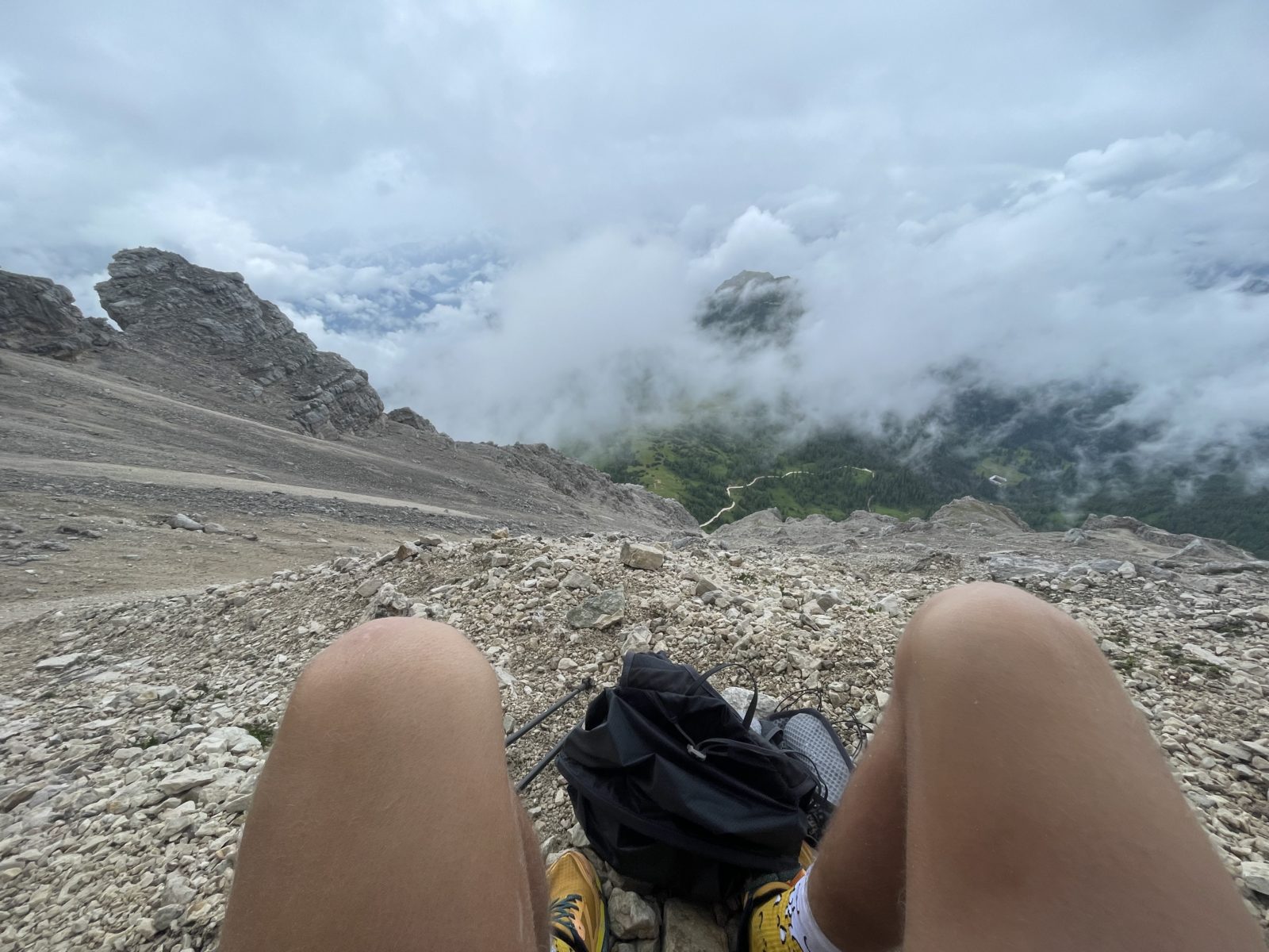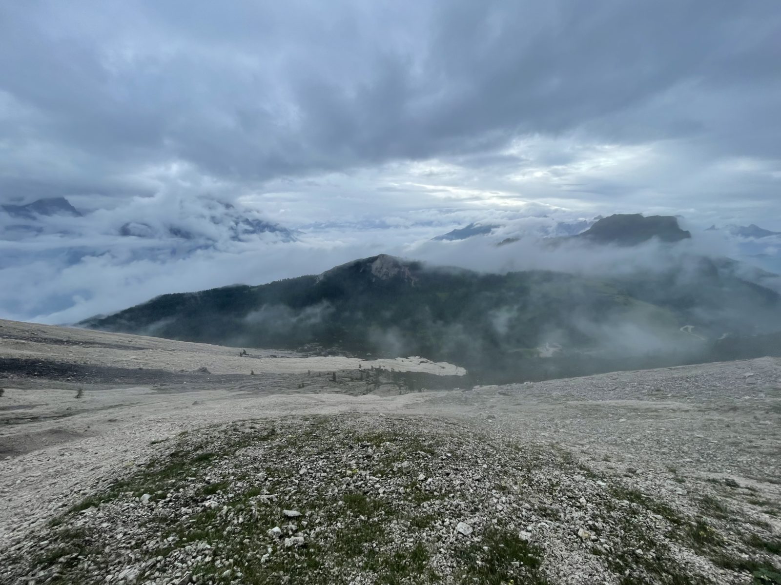 Počasí sice vypadá všelijak, ráno i chvíli mrholí a různě se převalují mraky, ale zkusím vylézt na Monte Pelmo (3172 m), horu, na kterou začíná stezka přímo u chaty. Je to 1200 m stoupání. U snídaně zjišťuju, že německý pár, co je tu taky ubytovaný, se tam chystá také.