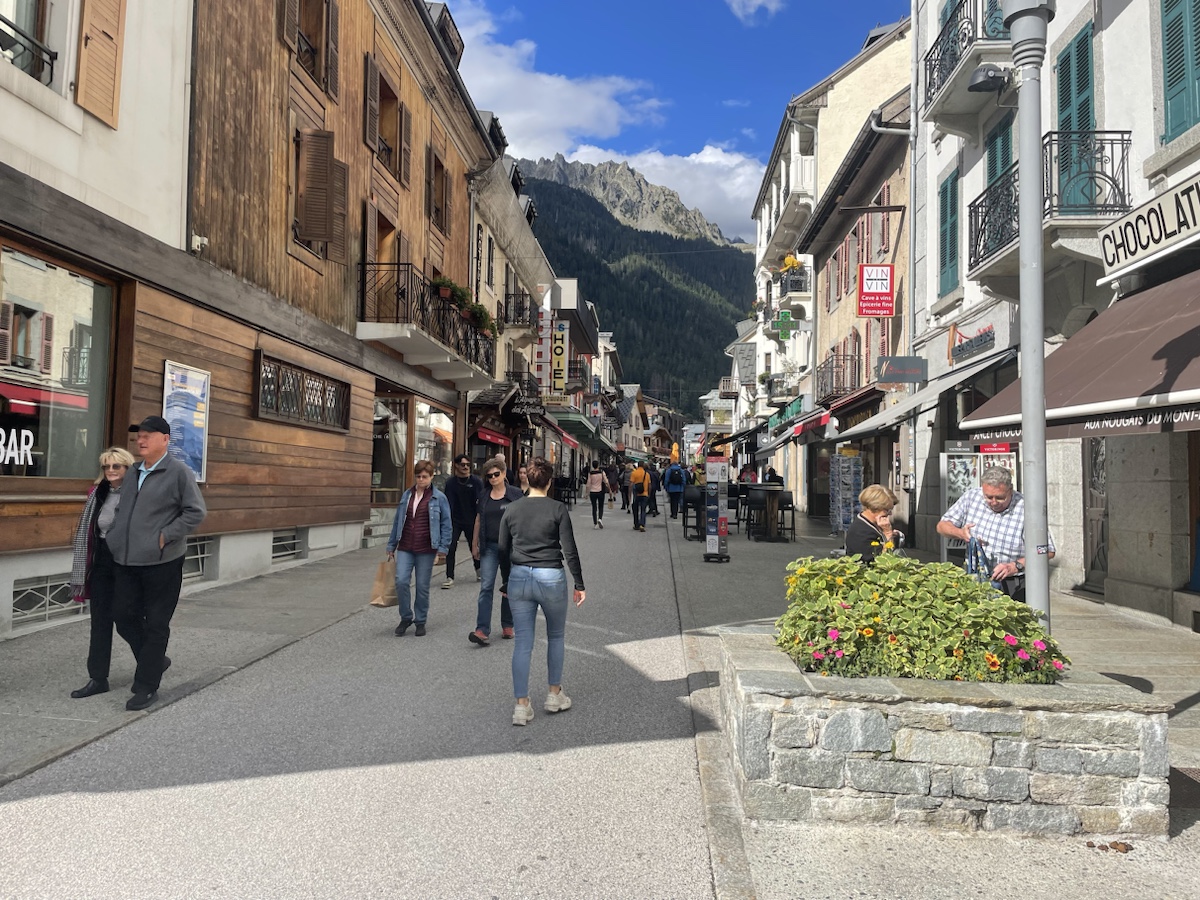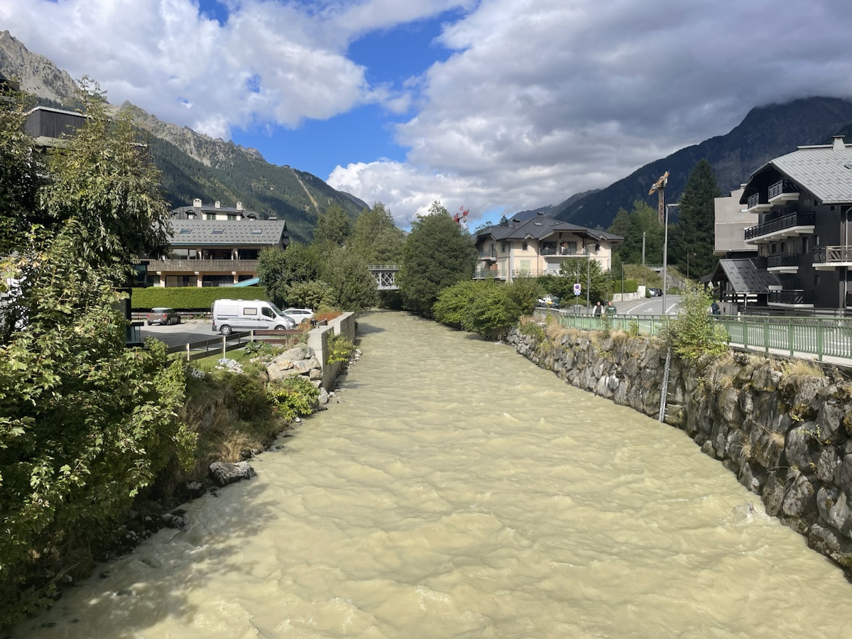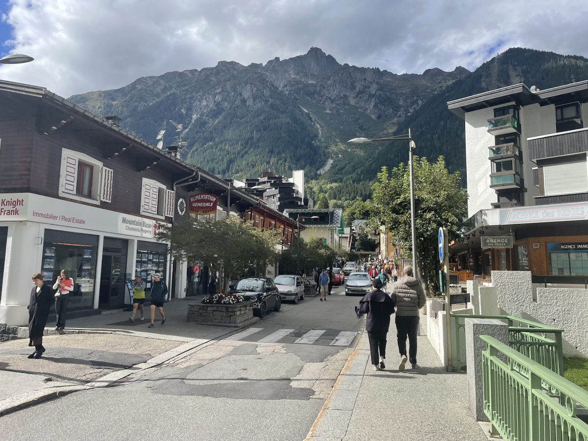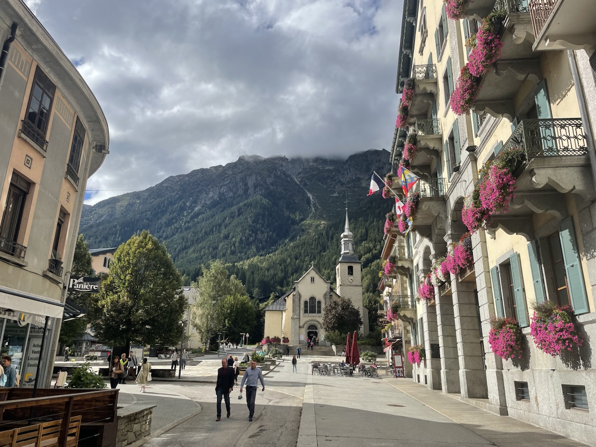 Někdy po třetí odpoledne jsme konečně v cíli. Chamonix. Centrum města je hezké a ty hory okolo taky. Bohužel masív Mont Blanku se dnes schovává v mracích, ale i tak je to fajn.