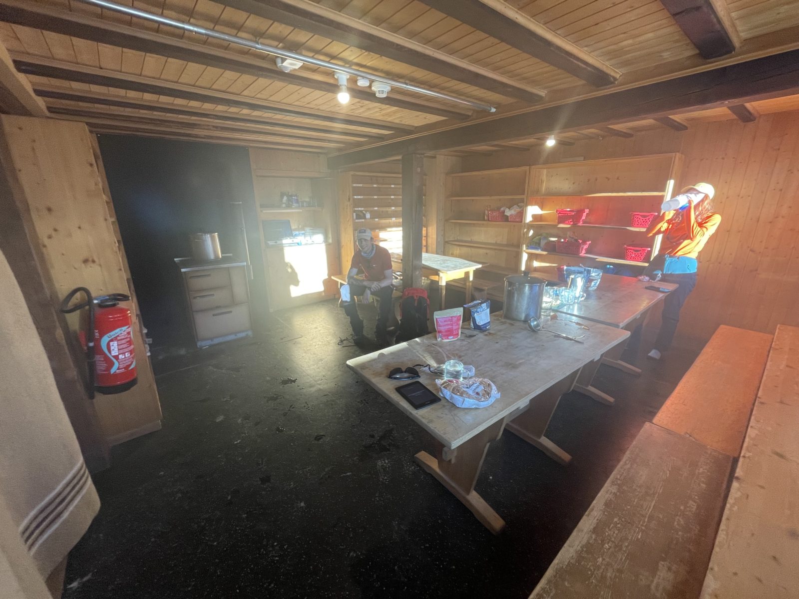 Posilněn pokračuju. Stoupám a stoupám, až jsem v 17:04 u chaty (2825 m). Kouří se z komína! V chatě je skupina 4 britských horolezců. Venku před chatou sedí ještě jedna dvojice, ale ti půjdou za chvíli dolů.