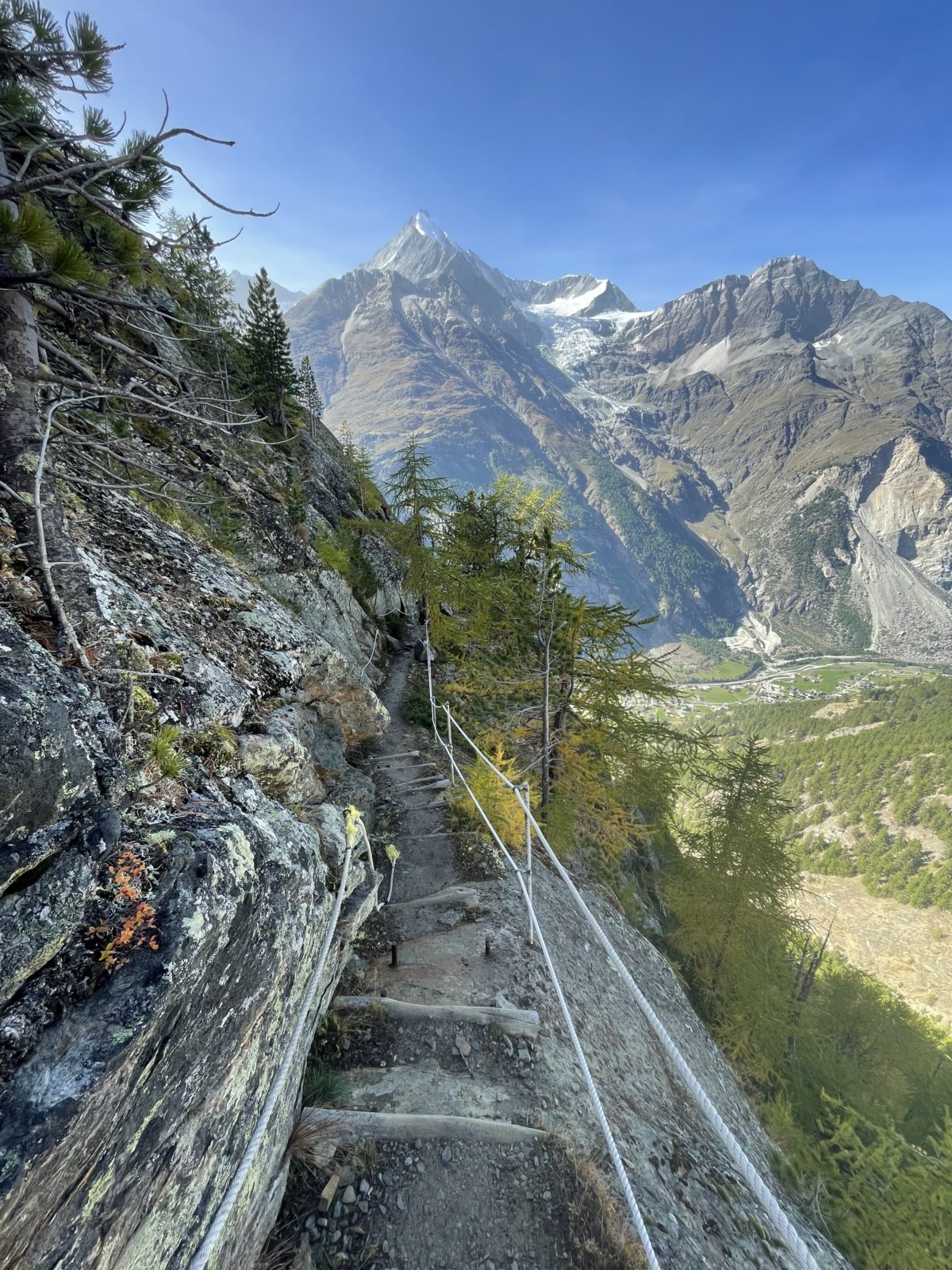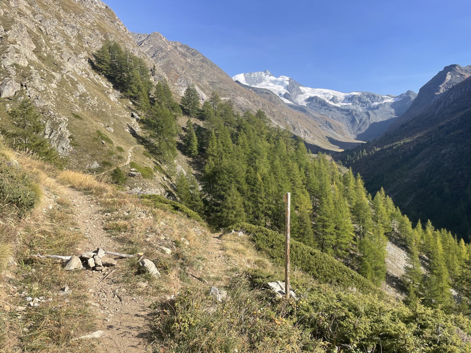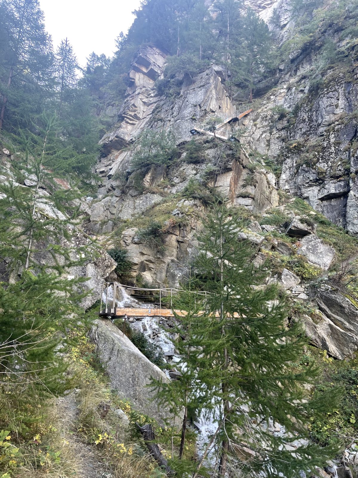 Jídlo mi bodlo. Ve 13:40 pokračuju. Prve klesnu 200 m k mostu. Je tu relativně dost lidí. Přejdu na druhou stranu a pokračuju dál. Další destinace je Täschalp – 10 km a asi 400 m stoupání (a taky klesání). Tam je nějaké ubytování, ale na můj vkus je to hodně drahé – noclehárna s polopenzí za 105 franků. Takže pokud mi nedají slevu, tak asi vylezu o dalších 400 m výš do chaty Täschhütte.