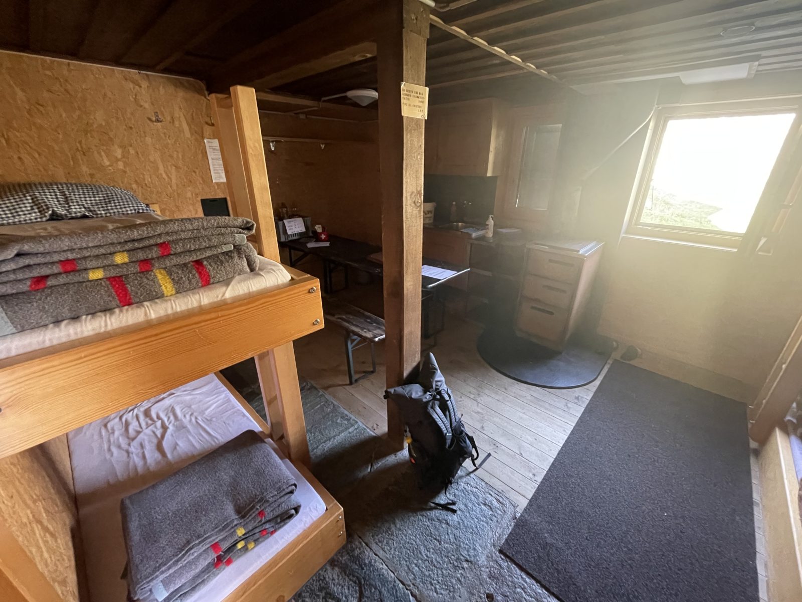 Na chatě jsem v 17:13. Nikdo tu není! Tak to jsem zvědav, jestli to tak i vydrží. Zimní místnost je fajn. Jsou tu palandy a taky kuchyňka a kamna. A pár nápojů ke koupi. Na stole je cedule, že voda je k dispozici 100 m východně od chaty. Jdu se tam podívat. Je to spíš tak 300 m – teče tu řeka. Jenže je to hrozně kalná voda. Chtěl jsem se omýt, ale vzdávám to. Jdu zpět k chatě.