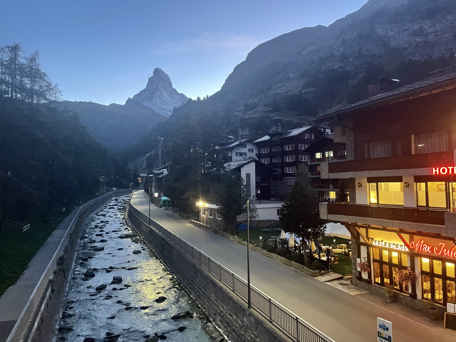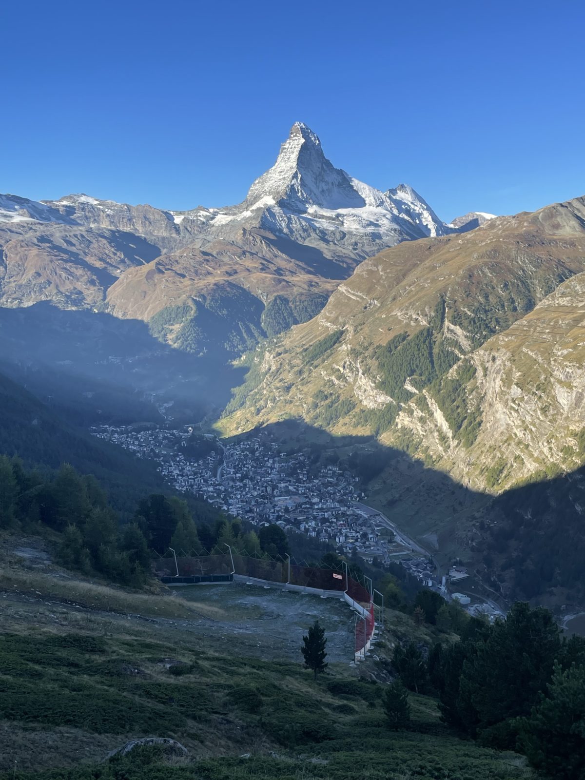 Prve sestoupím zpět dolů k Täschalp, trvá to ani ne půl hodiny. Pak přejdu potok a pokračuje travers nad údolím. Jak dojdu za roh, tak se mi ukáže Matterhorn, už celkem zblízka. Matterhorn teď už uvidím skoro furt. Je to fajn kulisa.