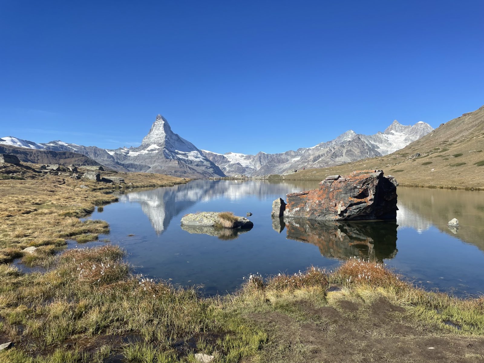 Asi po hodině a půl dojdu k odbočce směrem nahoru. Chvilku se rozmýšlím a pak se rozhodnu do toho jít. Vylezu ke Stellisee, které je populární tím, že se v něm hezky zrcadlí Matterhorn. Klasický insta spot.