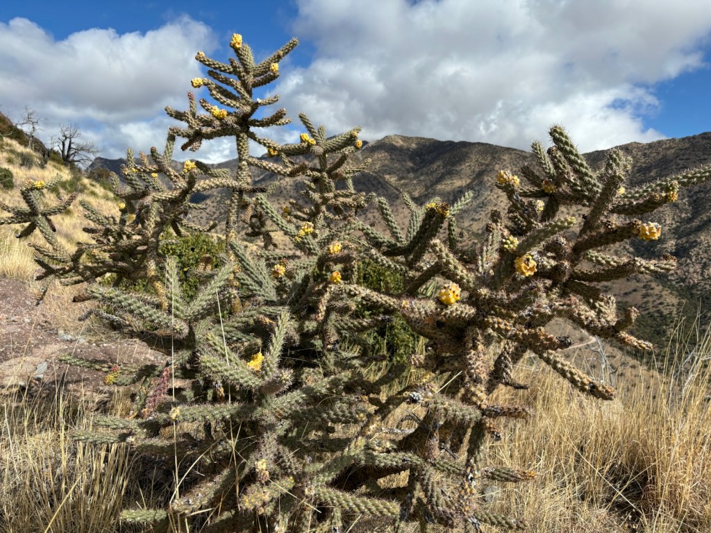 Je tu taková vyschlá tráva a k tomu různé kaktusy a křoviny.