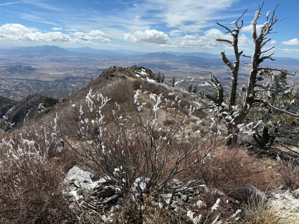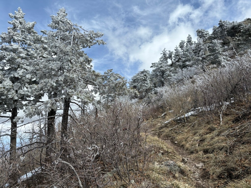 V 12:12 dojdu do sedla. Odtud se dá za 10 minut vylézt o kus výš na kopec Miller Peak (2886 m). Neodolám a jdu na to. Jsou tu zbytky sněhu. A na stromech je námraza, je to hezké.
