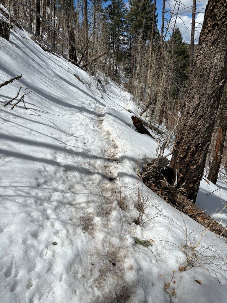 Když se napojím na hlavní stezku, tak začíná klesání a je tu sníh! Je to hezká atrakce.
