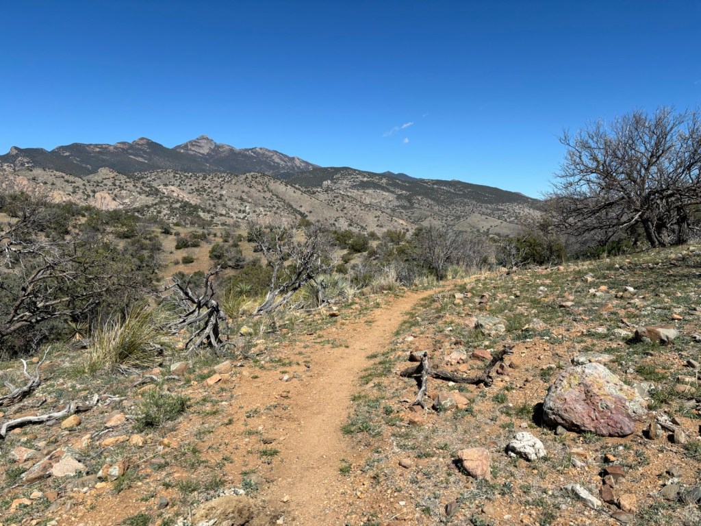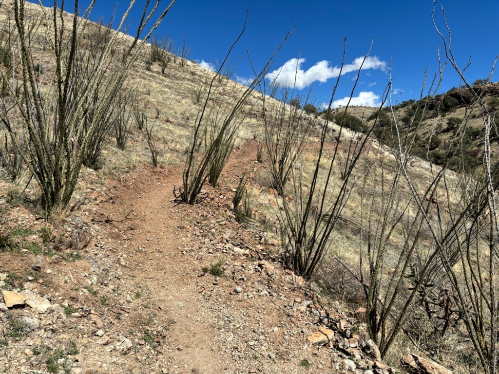 Ve 12:45 potkám četu, co pracuje na stezce. Tak se bavím s holkou z té party. Už tu na tom v okolí dělají 6 týdnů. Přes týden spí ve stanech a na víkend jedou dom do Tucsonu. Má to jako full time job.