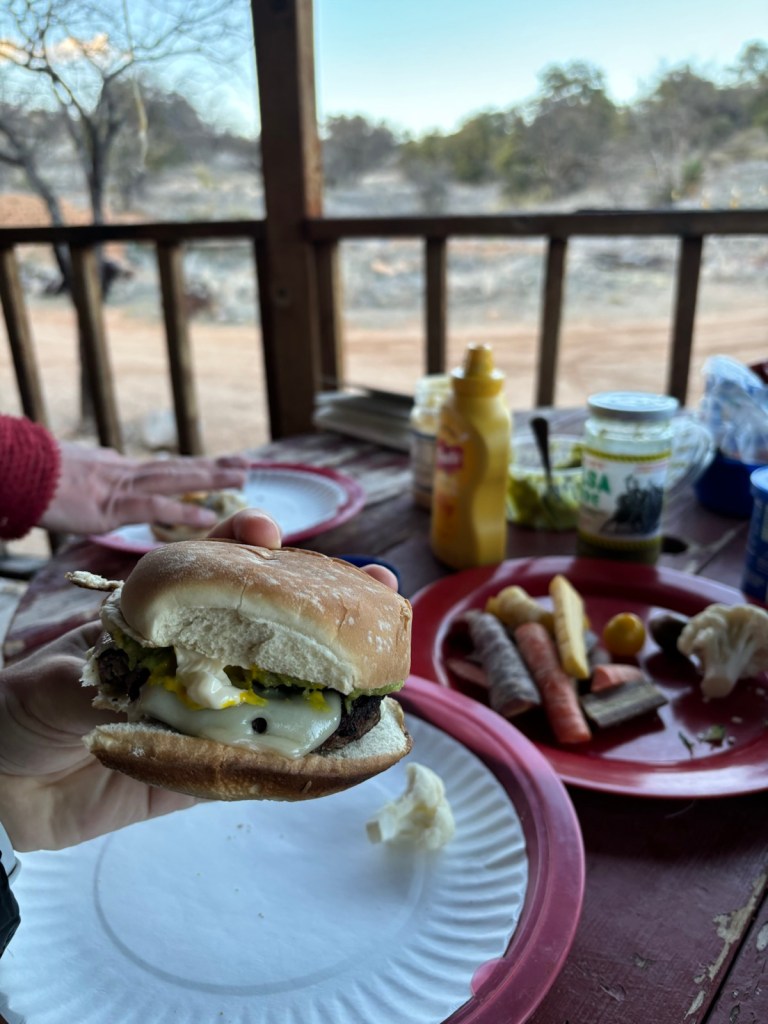 Vychází to přesně, máme pár minut k dobru. Je tu už jedna holka, co jede na kole a potkal jsem ji včera u ohně. A jeden další hiker. Každý dostane burger!