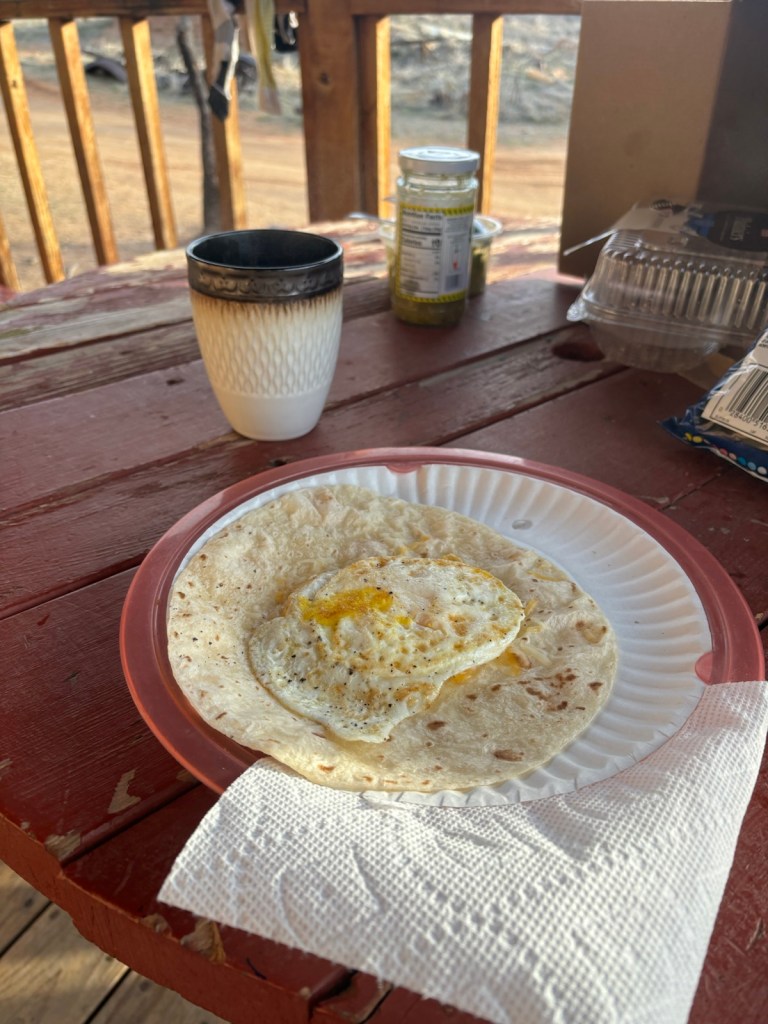 Po sedmé jsem sbalený a jdu na snídani na trail magic. Dostanu tortilu zapečenou s vejcem a sýrem. Dám si na to salsu a sýr.