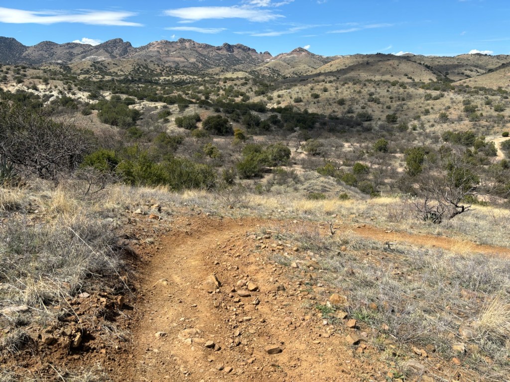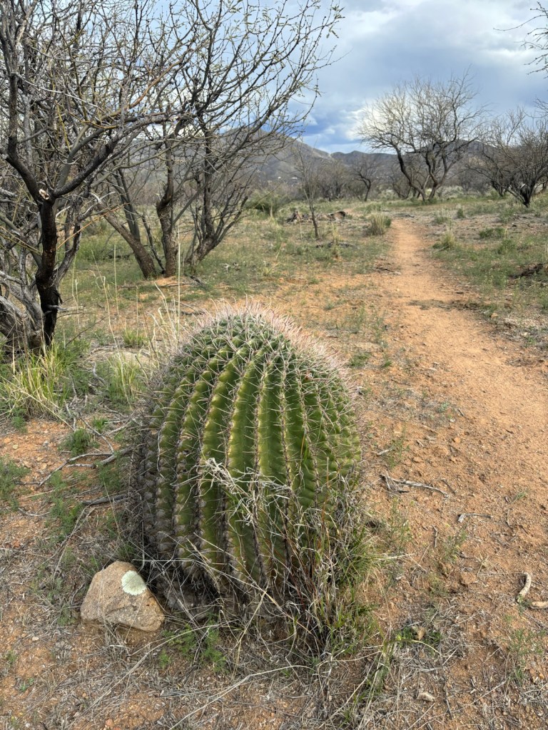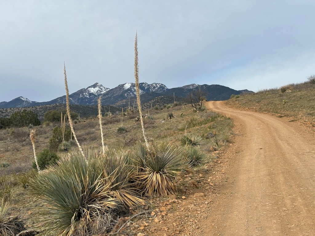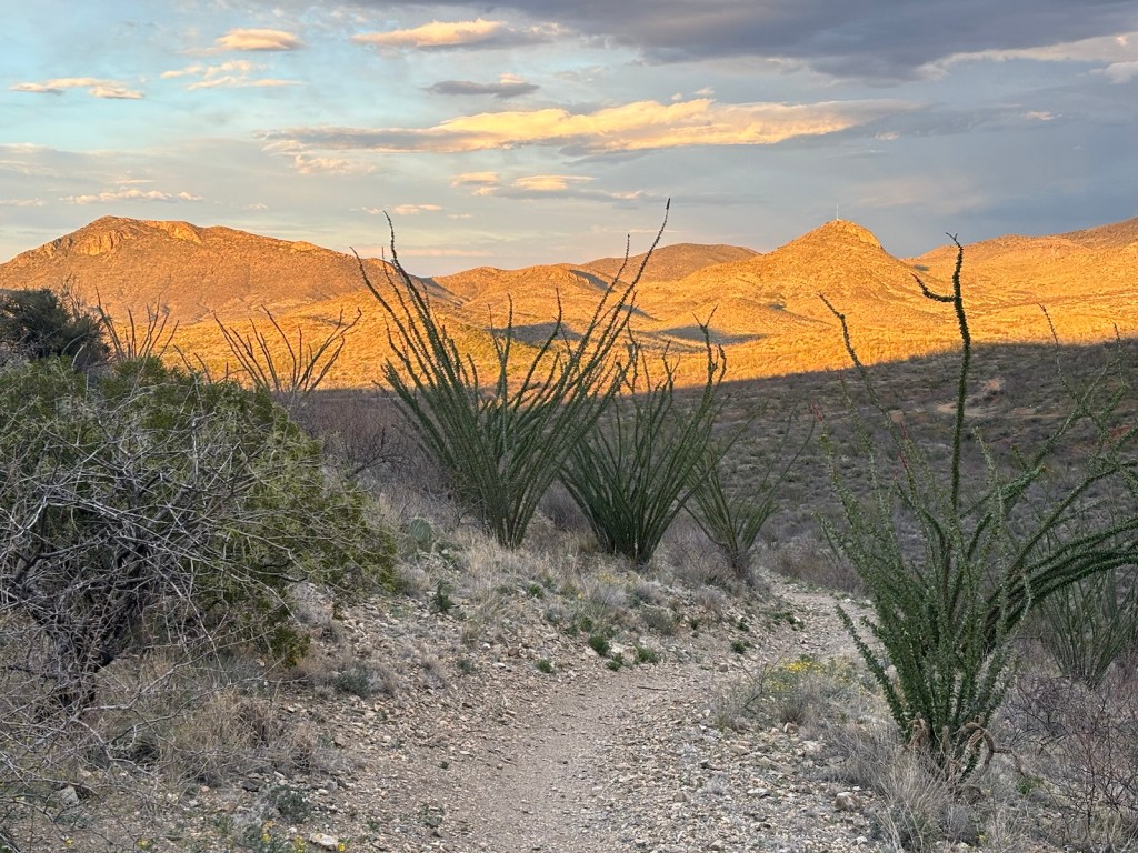 Místo nacházím asi v 18:20. Je tu hezký výhled na Tucson a hory v dáli, kam budu pokračovat zítra.