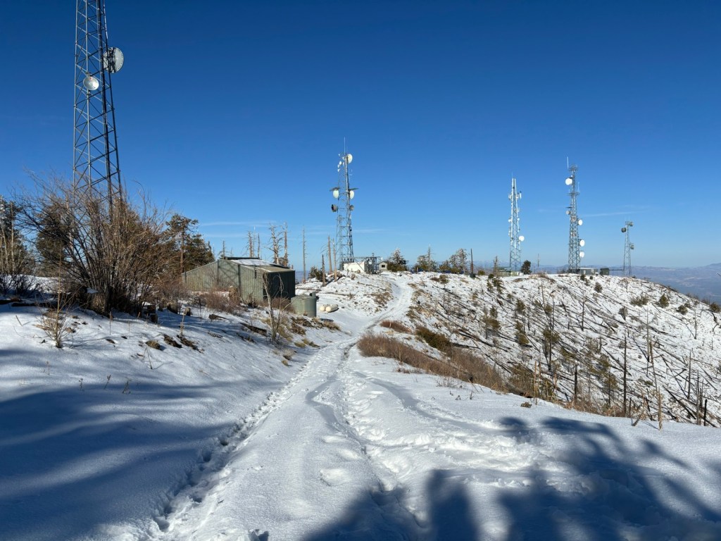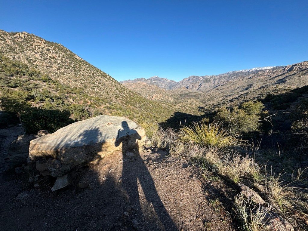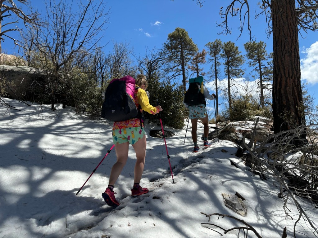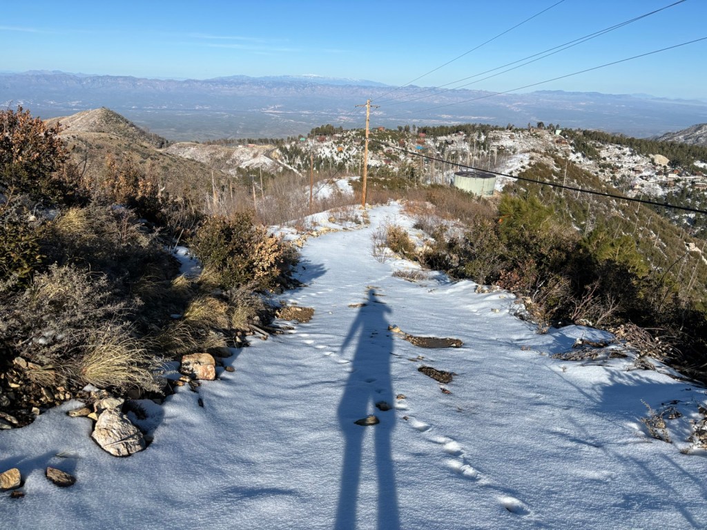 Asi o půl druhé postupně začíná sníh. Jsme ve výšce asi 2200 m a hlavní výstup máme za sebou. Dojdeme na rozcestí. Buď můžeme pokračovat po hlavní stezce a jen se trochu vlnit kolem stejné výšky a pak dojít do Summerhaven. Anebo to vzít po hřebeni až na vrchol Mount Lemmon. Volíme druhou možnost. Přijde nám, že to bude zajímavější.