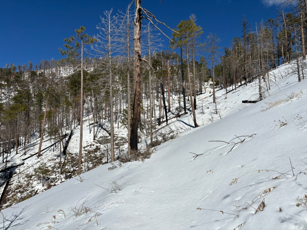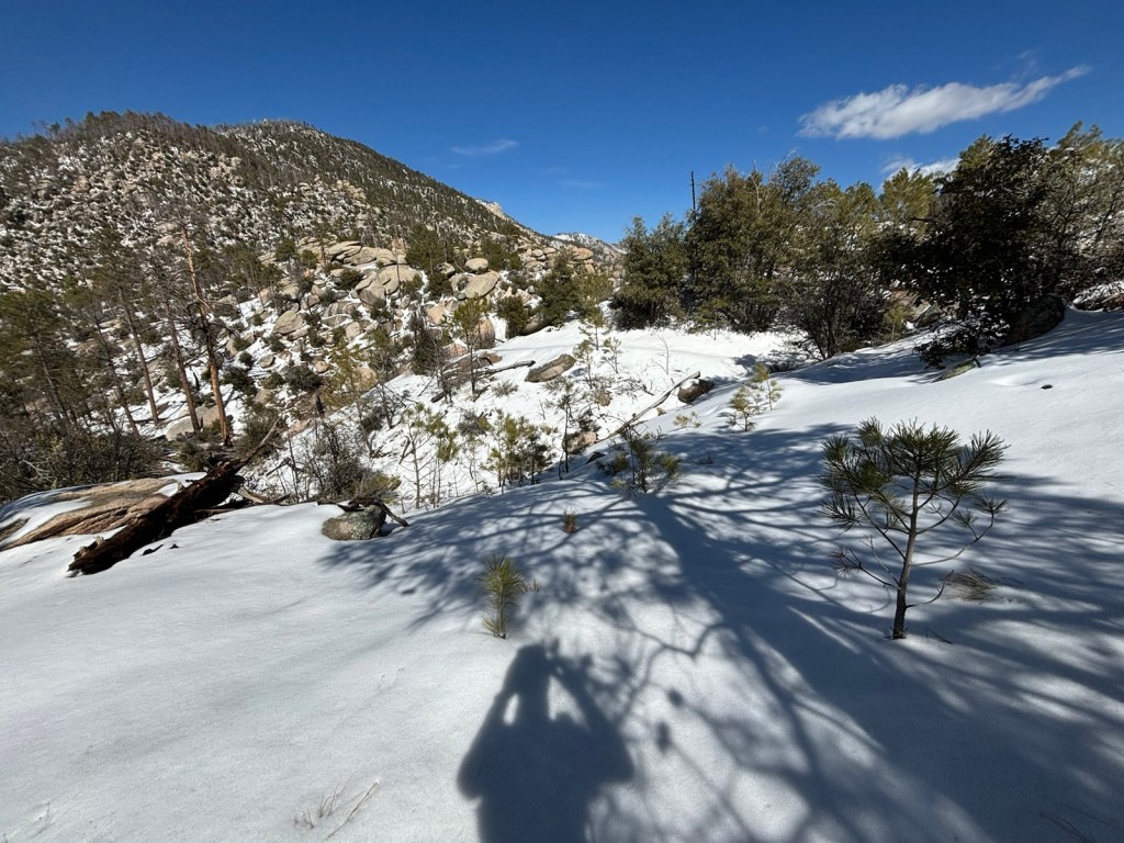 Pokračujeme tedy ve stoupání. Jdu první. Jak tak stoupám a postupně přibývá sněhu, tak si uvědomuju, že abych stihl obchod v Summerhaven, který zavírá v 5, tak to abych sebou hodil! Takže se nezastavuju a pokračuju výš a výš. Ve sněhu nejsou žádné stopy a je to namáhavé.