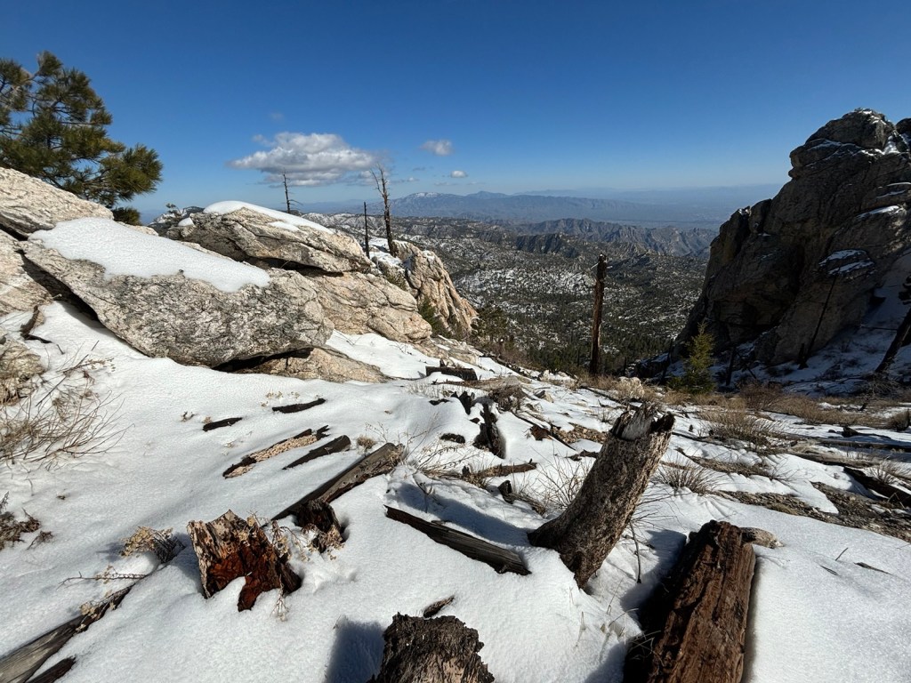 O půl 4. jsem v podstatě nahoře. Výhled do pouště pode mnou je bomba. Dávám konečně pauzu na sváču. Docela mi mrznou chodidla, jak jdu pořád sněhem. Při pauze trochu přijdou k sobě.