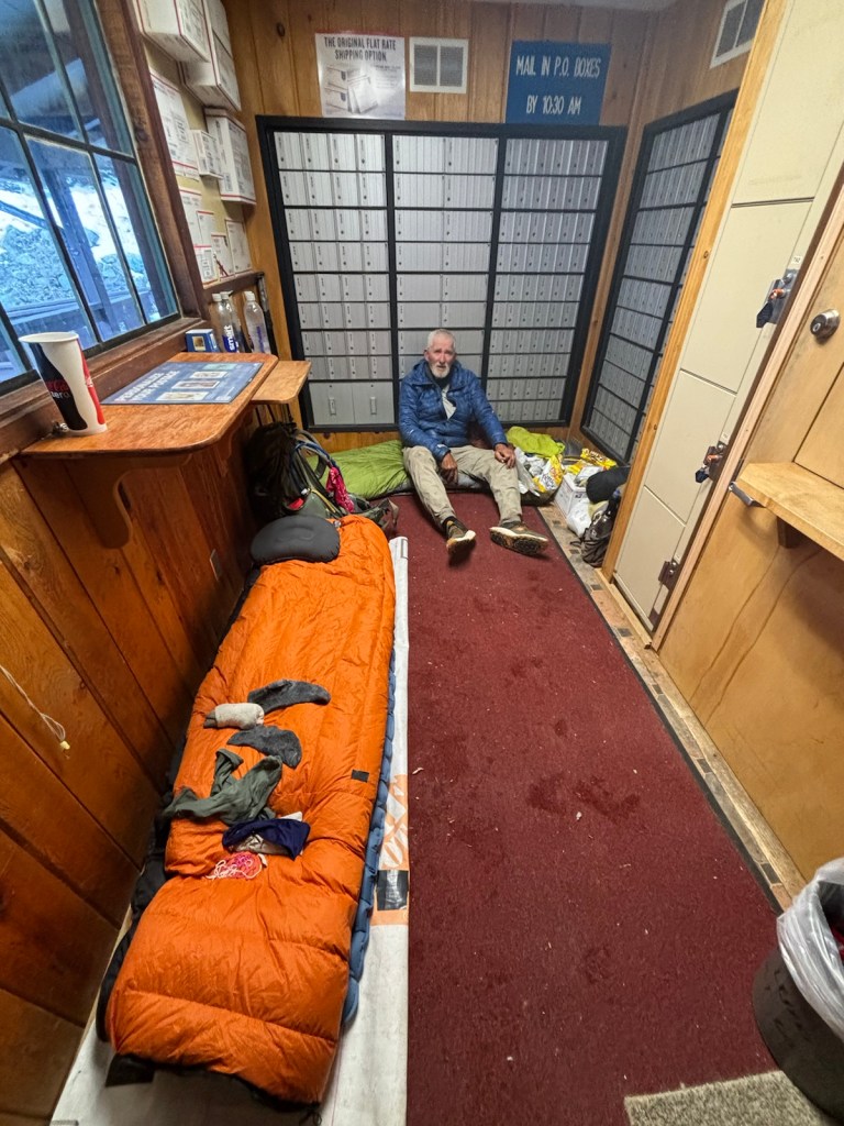 Pak jdu o kus dál k poště. Tady by mělo jít spát uvnitř ve vytopeném prostoru, kde jsou poštovní schránky. Už jsou tu nakvartýrovaní 2 starší hikeři a jedna hikerka. Je tu smrádek, ale teploučko. Bylo by tu pro mě místo, ale přijde mi to dost stísněné. Použiju to jako zázemí, ale ustelu si venku na zápraží. Je chladno, ráno by měly být 3 stupně. To bych mohl zvládnout.