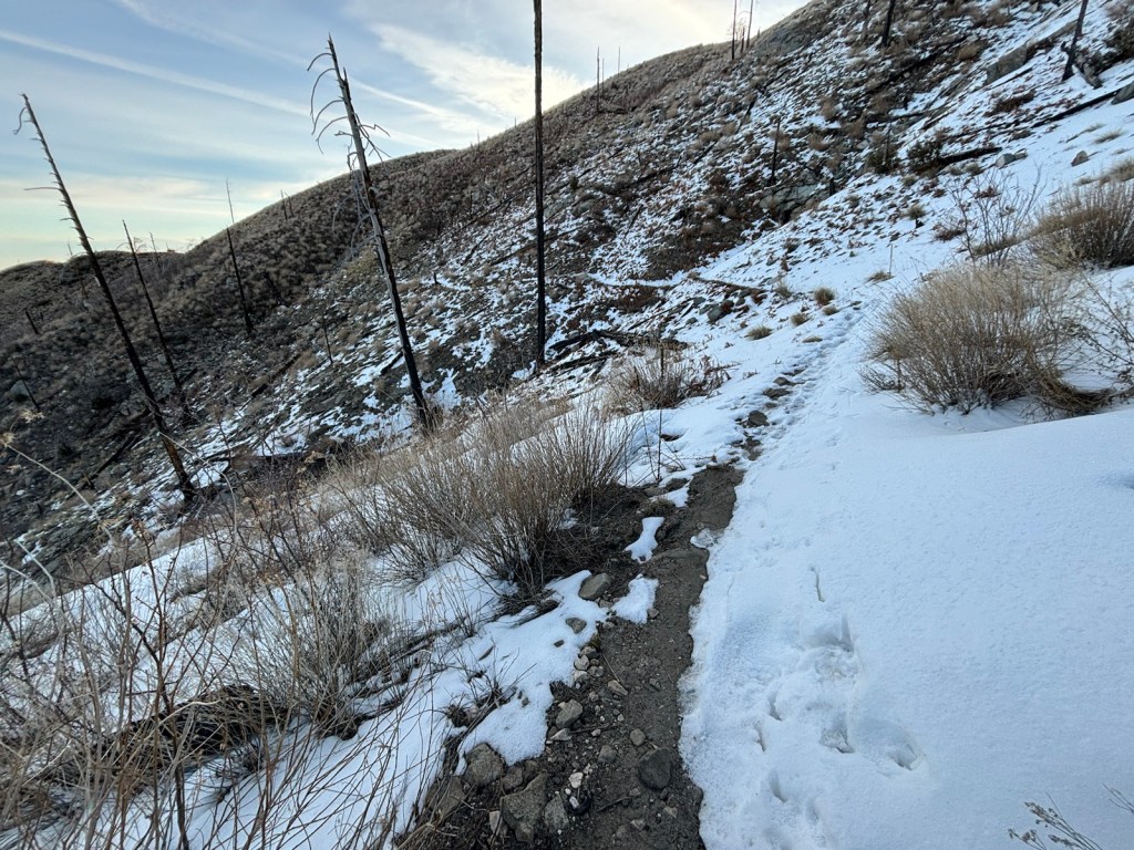 Snídám ovesnou kaši a vyrážím pár minut před půl sedmou. Je chladno. Vylezu po silnici nad město a pak už začnu scházet po hřebeni. Místy je tu zledovatělý sníh. Terén se trochu vlní. Po hodině procházím kolem stanu Lucky a Filipa. Vypadá to, že ještě spí.