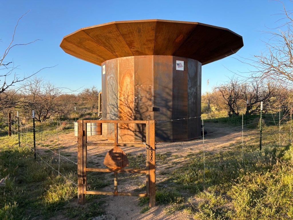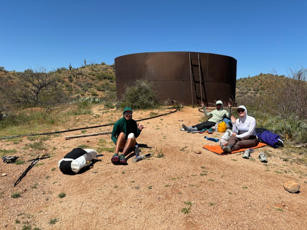 V 10:27 dojdu k tanku s vodou. Už jsou tu ti dva cyklisti, co kolem mě projeli večer. Za chvíli přijdou další 4 hikeři, co tvoří partu. Pak přijde Doc – další hiker, který nám povídá historku, jak v noci šel spát k nějaké hodně pochybné trail angelce v Oracle a během noci utekl pryč a od té doby šlape, takže vůbec nespal. Je to mimojiné tripplecrowner (prošel PCT, CDT i AT).