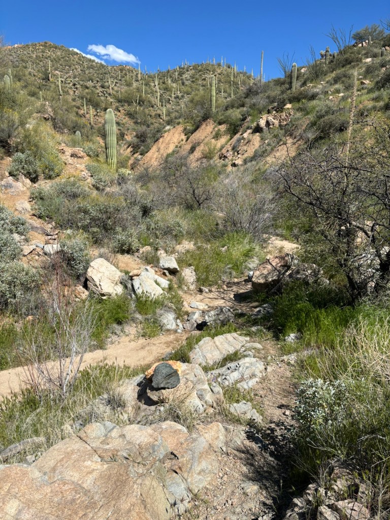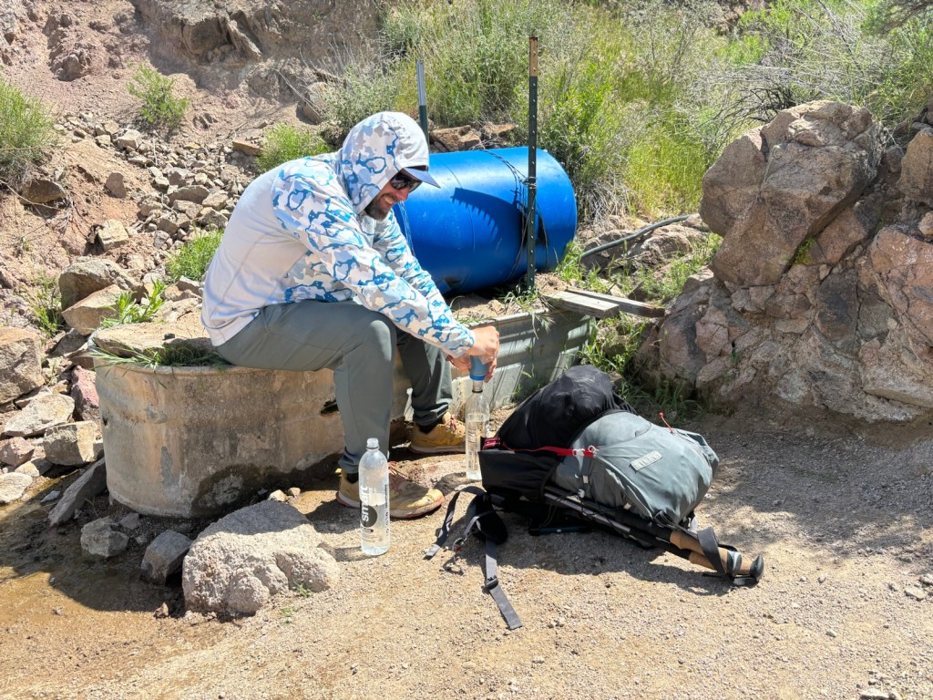 Pokračuju dál. Další voda bude asi za 11 km. Dostávám se do kaňonu a tam v 11:55 dojdu k plastovému barelu s vodou. Hadice přítoku je utržená. Naštěstí ještě voda je, ale za pár dní asi skončí. Za chvíli přijde Doc.