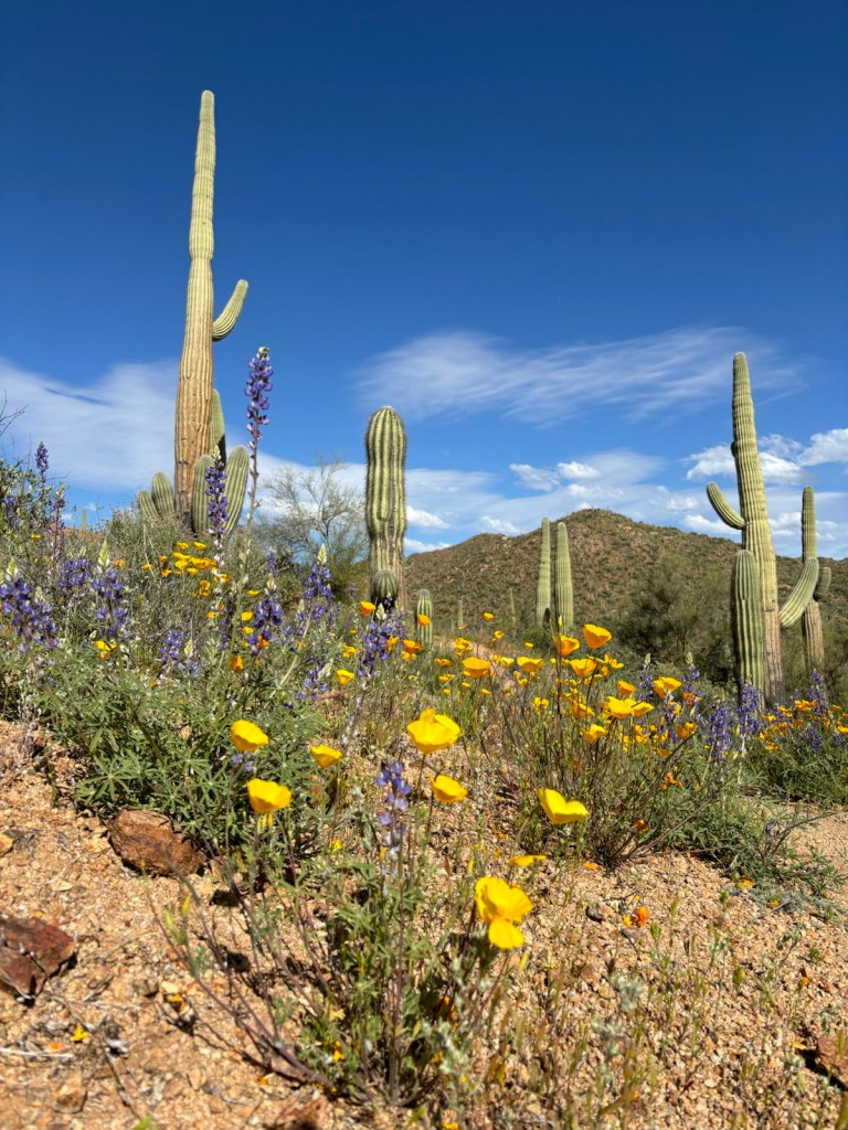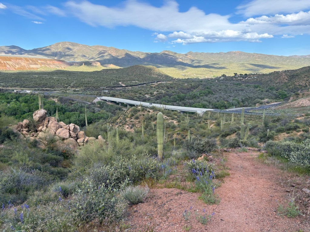 Pokračuju. Cesta vede chvíli kaňonem a pak začíná dost stoupat. S takovým kopcem jsme nepočítali! Je to makačka! Aspoň že tu všechno kvete, tak je to hezké. I výhledy zpět do krajiny jsou fajn.