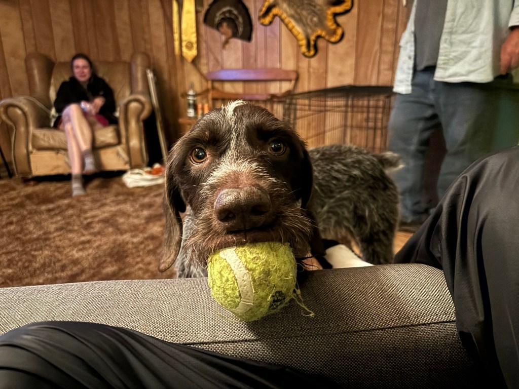 Tak kolem 5:30 se kolem mě začíná ochomejtat pes. Chtěl by si hrát s míčkem. Možná kolem šesté vstanu a chvilku si s ním venku hraju.