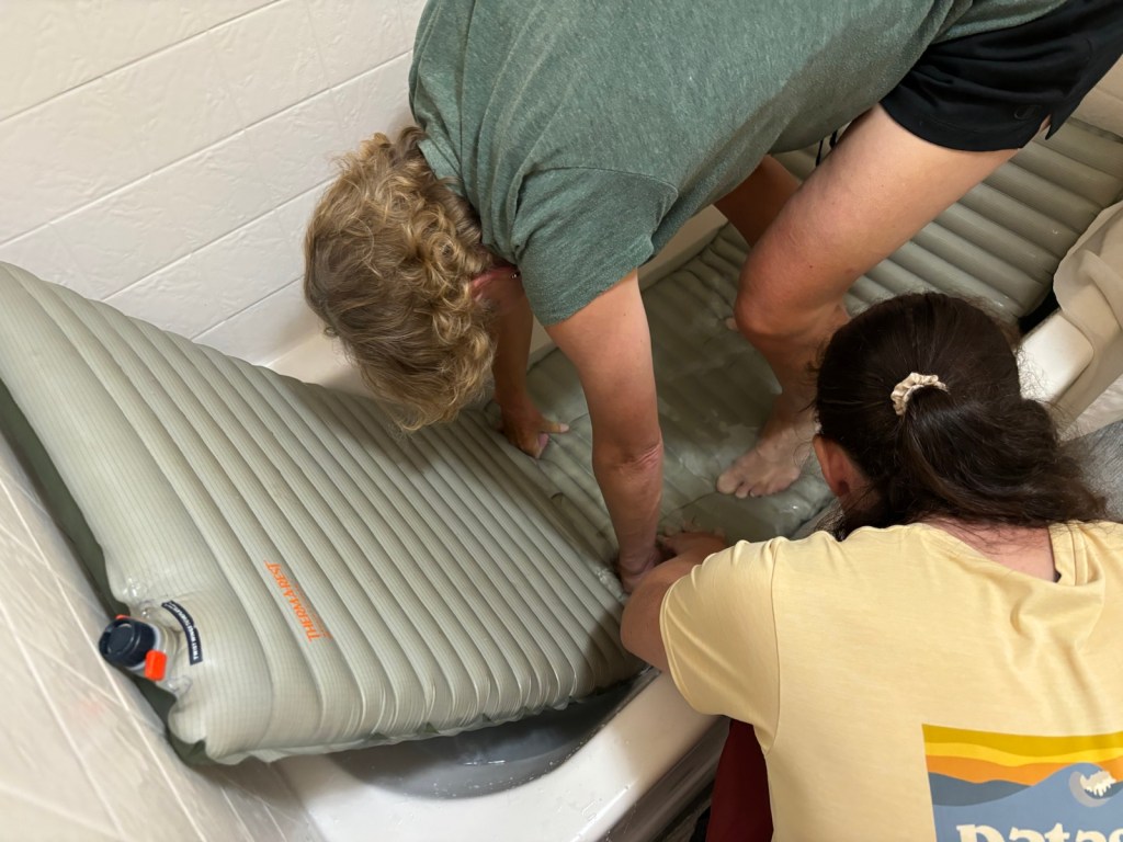 Pak jdem na hotel a ještě něco děláme. Holky se snaží zalepit Alenčinu nafukovačku. Má několik míst, kde uchází. Zřejmě od výroby. Bohužel do rána zase ujde, takže mise byla neúspěšná. Spát jdeme před desátou.