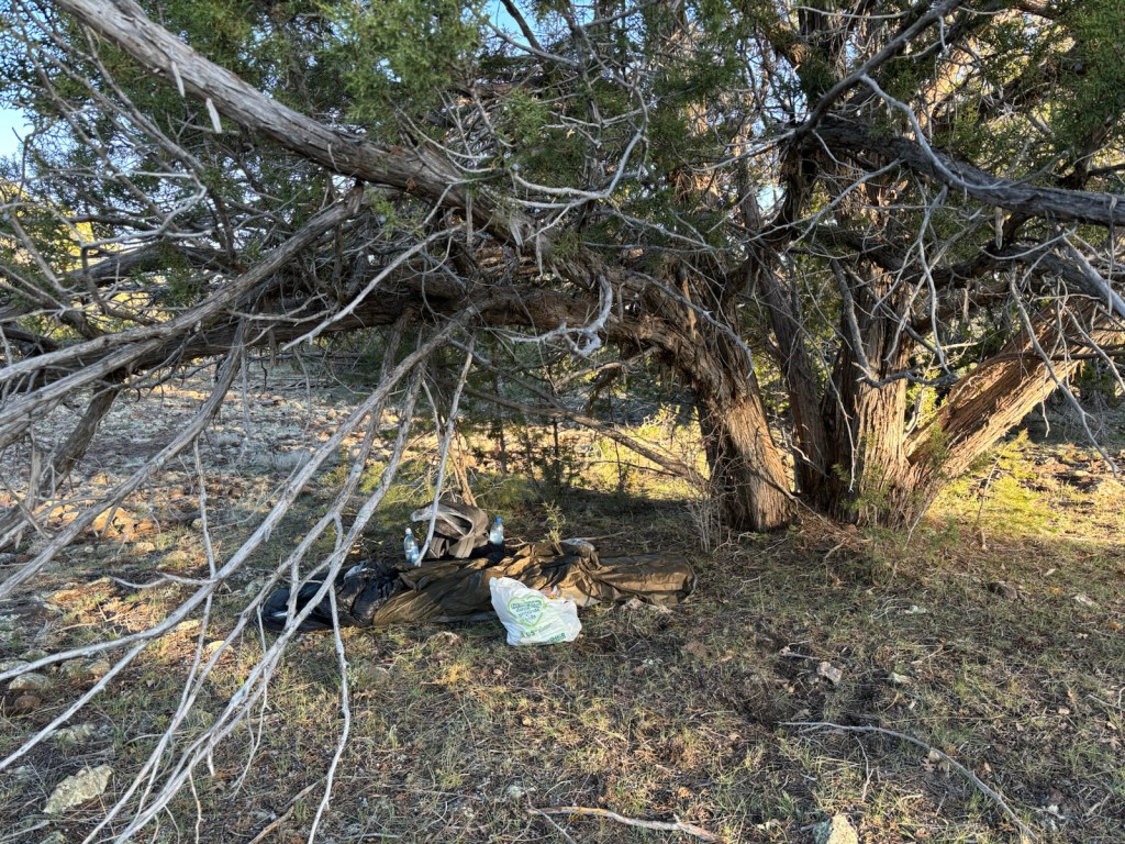 Zhruba v 6 nacházím hezké místo pod stromem, kde kupodivu nejsou šutry. A navíc je tu závětří. Jsem spokojen. Mám ještě hodinu světla.