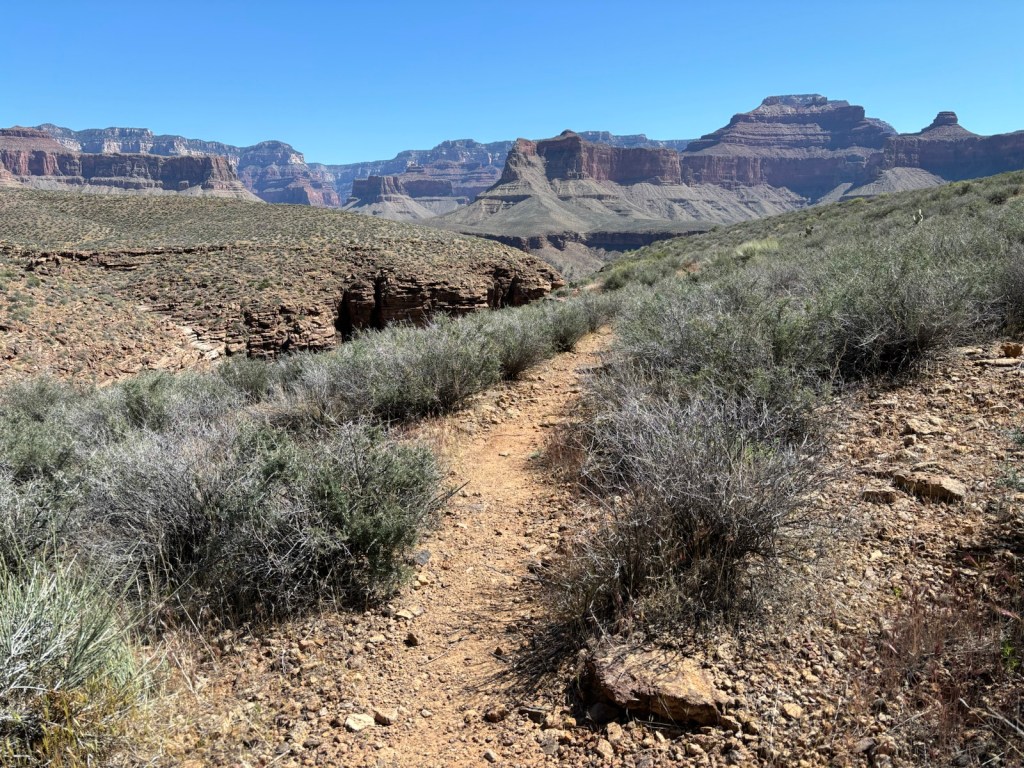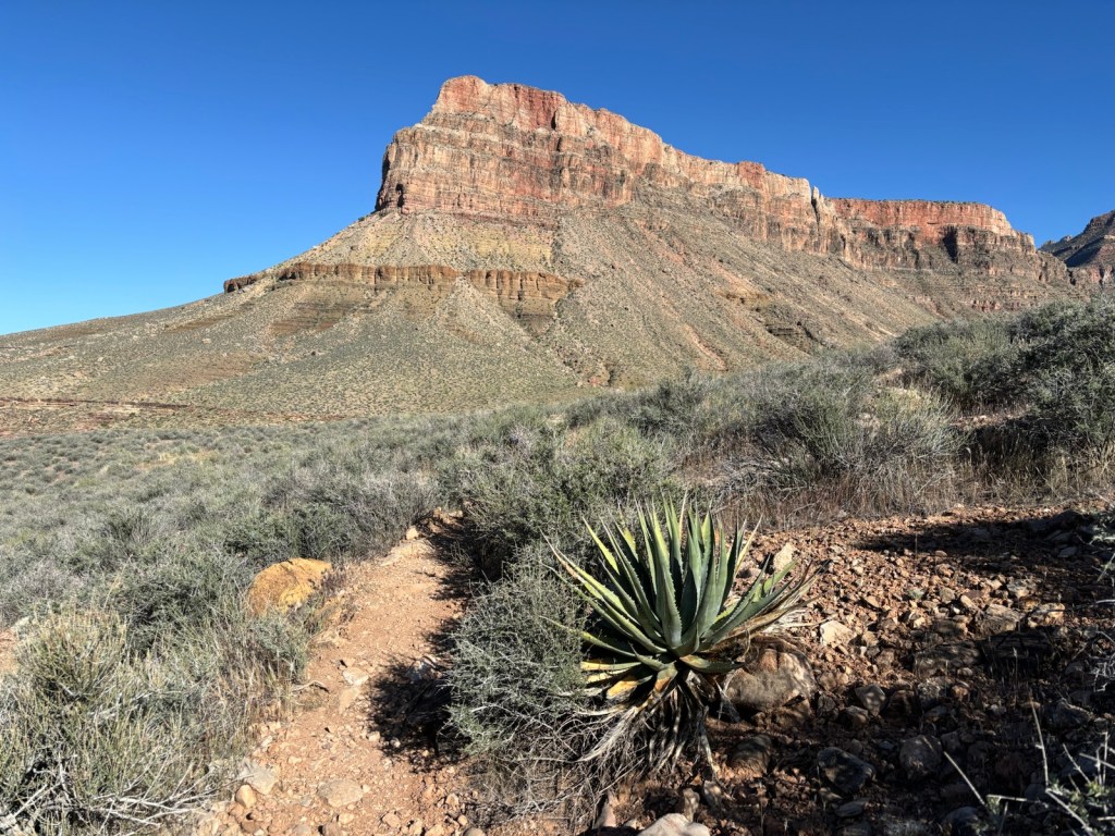 Vylezu asi 400 m po South Kaibab Trail k místu zvanému Tipoff. Tady se odpojuju doleva a pokračuju po Tonto Trail. Stezka je okamžitě mnohem horší a málo zřetelná, ale dá se to. Slunko už pěkně peče.