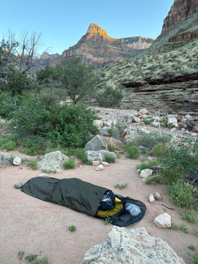 Po minulé zkušenosti na dně Grand Canyonu tentokrát ani nevytahuju spacák. Spím jen v hedvábné vložce a žďáráku. Ale trochu jsem to podcenil, protože nad ránem jsem musel spacák nakonec vytáhnout.