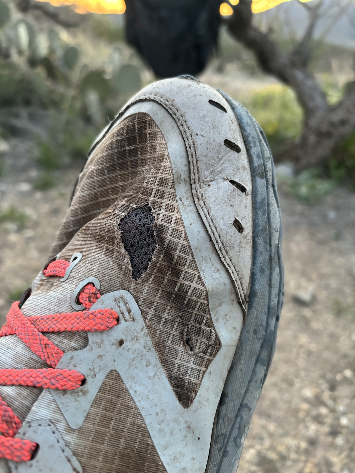 Trochu jsem váhal s botama. V zásadě poslední dobou nosím buď Altra Lone Peak, anebo Saucony Peregrine. Ty Altry jsou takový pohodlný papučky, ale například v roce 2022 na Cape Wrath Trail mě ke konci bolely klenby (nebo aspoň jedna). Samozřejmě je otázka, čím to bylo. Nakonec jsem se rozhodl pro Altry a bylo to dobré rozhodnutí. Neměl jsem žádný problém. Předem jsem teda čekal, že budu potřebovat 2 páry, což se taky stalo. Nový pár jsem koupil po 21 dnech v Paysonu. Na začátku jsem měl verzi 6.0, nové byly 7.0. Chtěl bych v budoucnu vyzkoušet boty Topo, prý mají mnohem větší výdrž a taky nemají zero drop, což je pro většinu lidí lepší. Zero drop sice zní skvěle, barefoot a tak. Jenže když na to běžný člověk není zvyklý, tak to pak může vést k problémům. Ale boty Topo je obžížné sehnat.