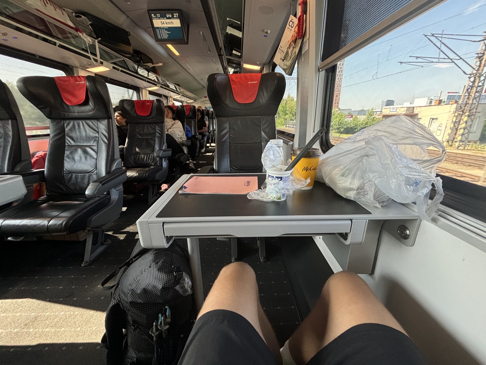Ráno vstávám celkem nevyspanej před sedmou. Ještě si zacvičím, pak se dobalím a pak jedu na vlak. Ten jede na čas v 9:22. První třída má něco do sebe. Od začátku se o mě stará stevard. Skoro mi vnutí časopis, což není stížnost. Spíš se zdá, že fakt chce, abych si cestu užil! A celkově ten oddíl má takovej dobrej vibe, je tu klid.