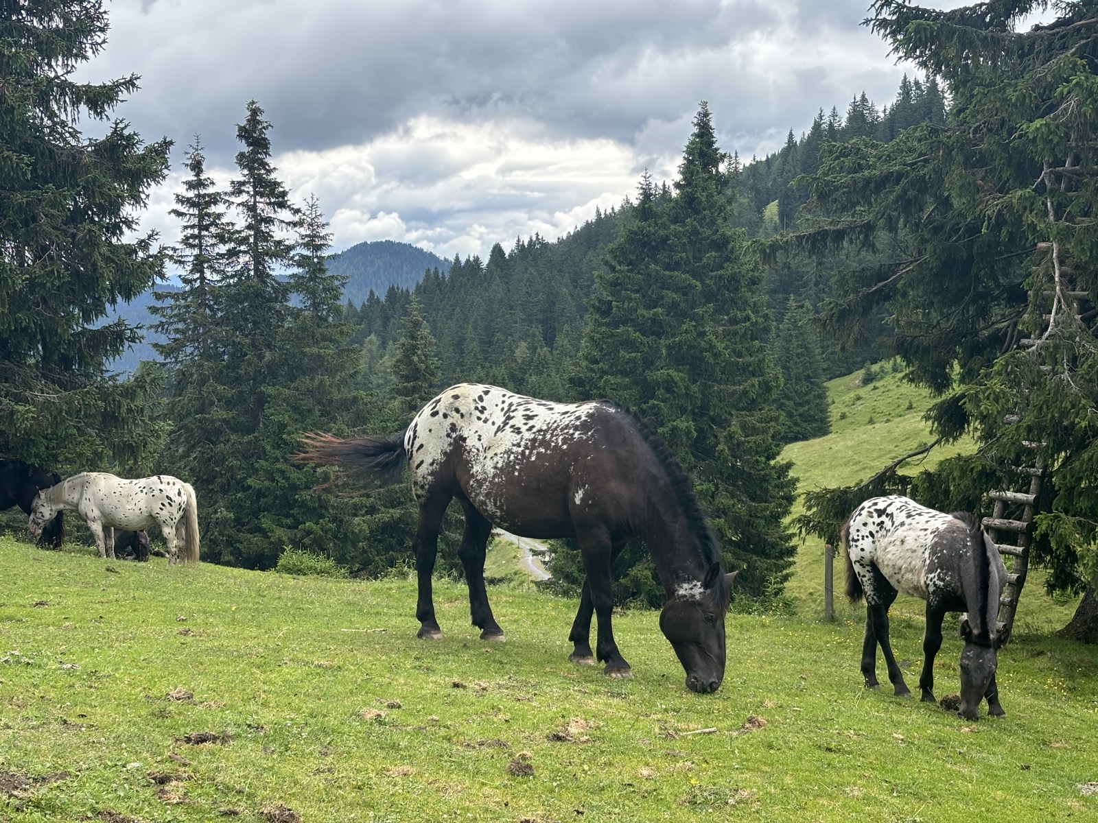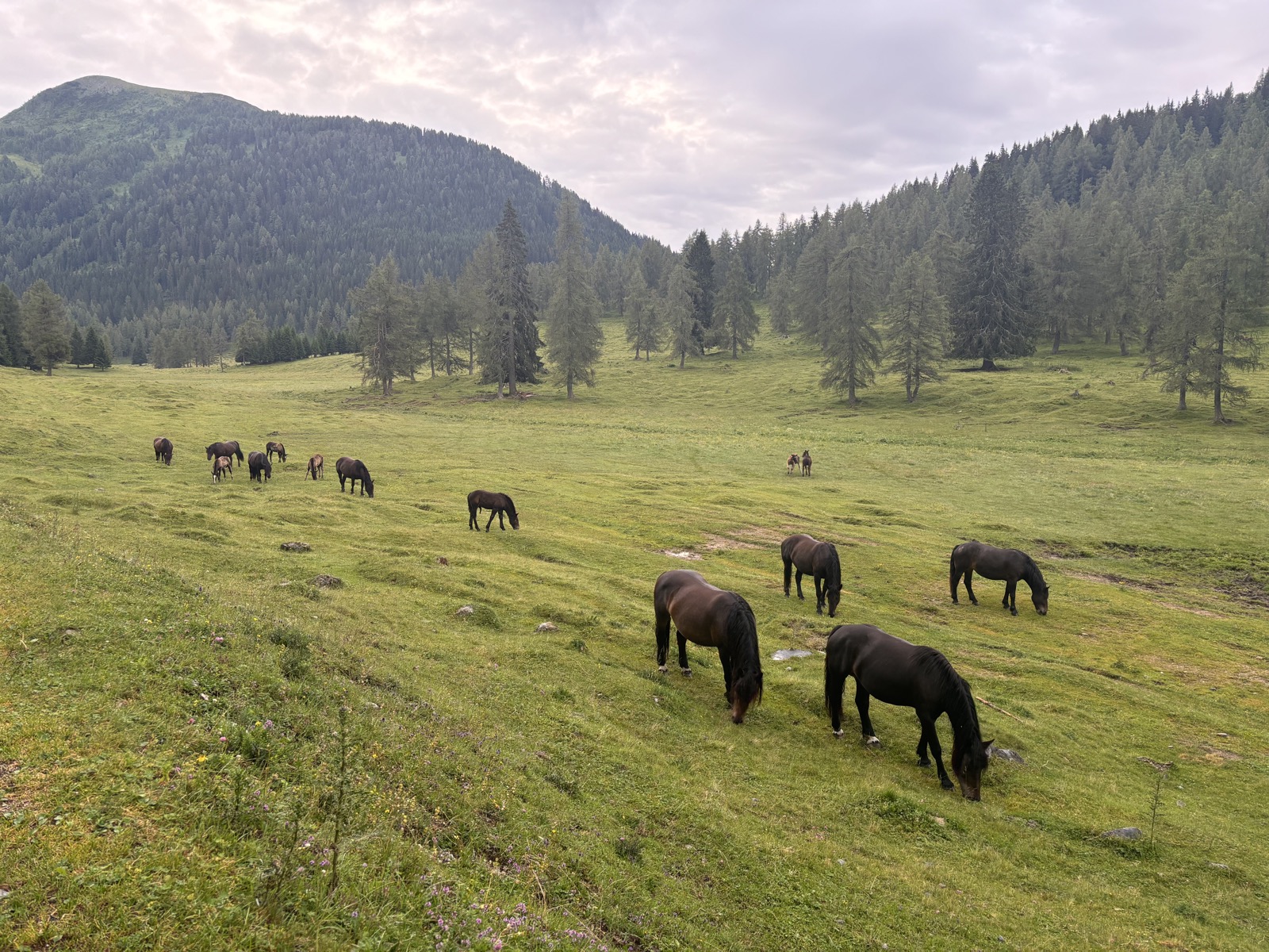 Vyrážím v 6:40, dobrý čas! Je zataženo a mokro, asi ráno pršelo. Jdu po asfaltce údolím. Na louce se pasou koně.