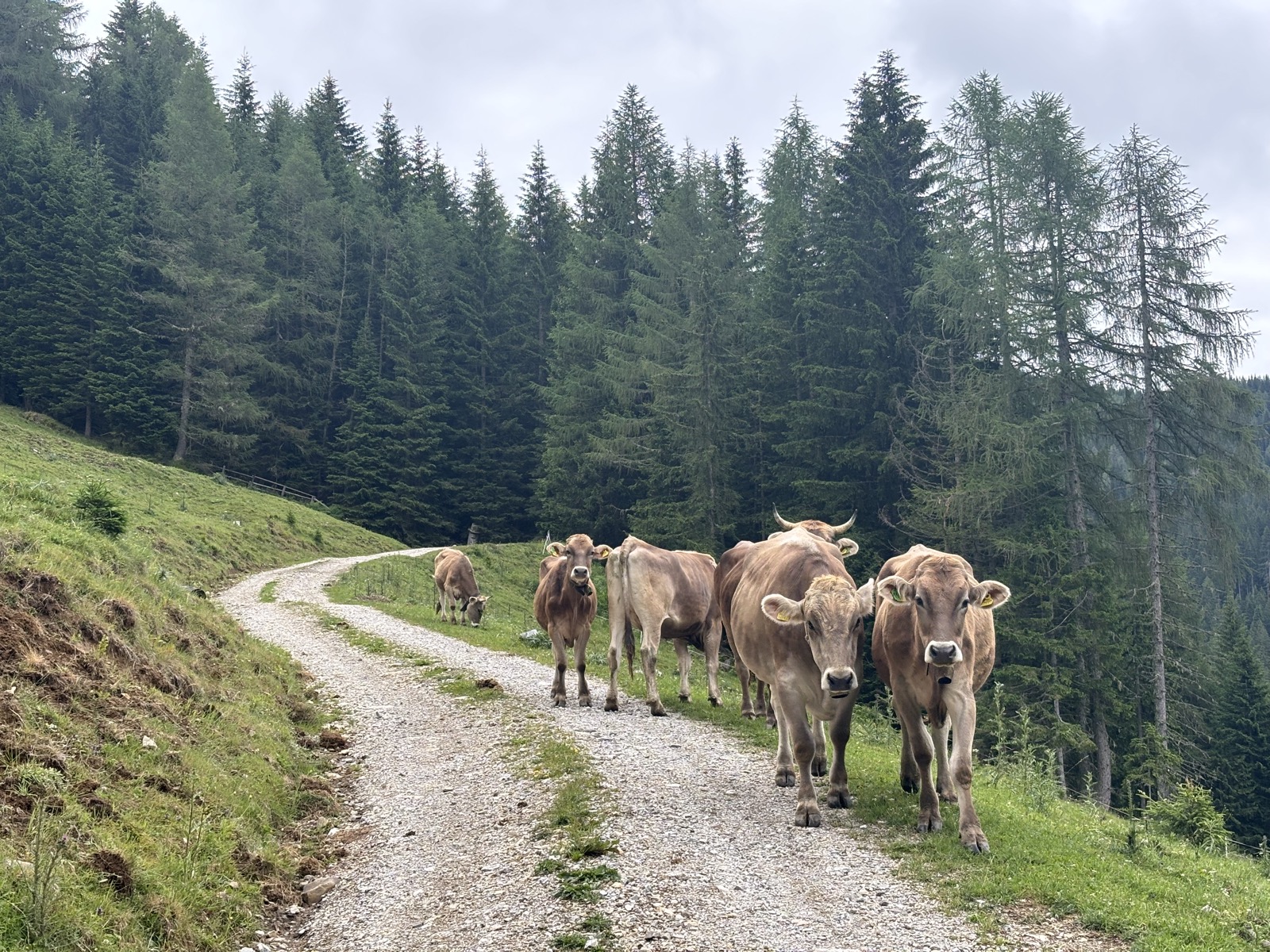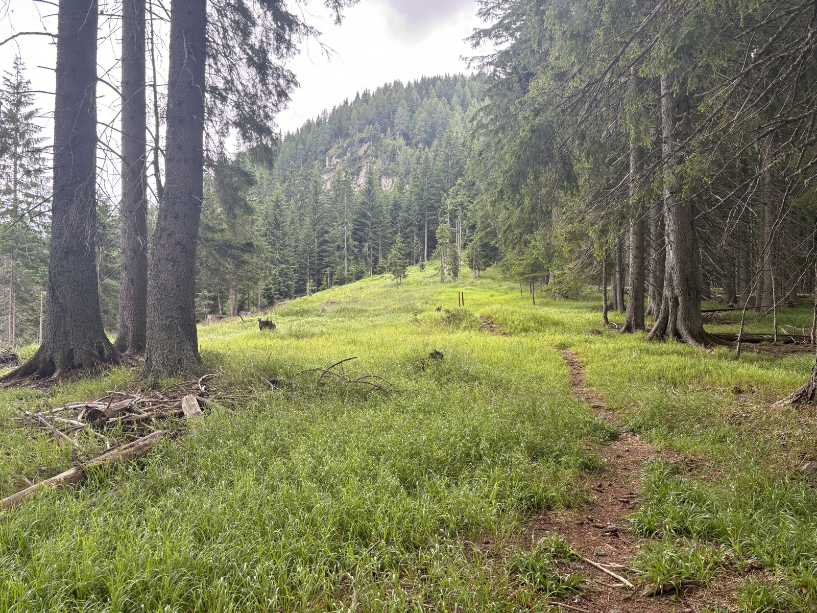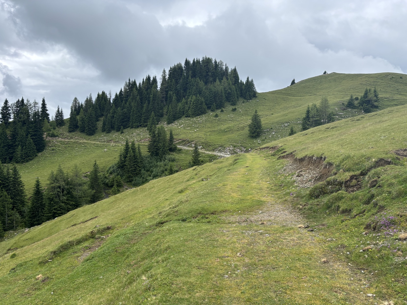 V 7:50 přijde odbočka z cesty na zarostlou cestičku. Je pořád velmi mokro. Vede to pak dál do lesa a dolů a pak na dně přes potok a opět nahoru. Prve po cestičce a pak zase štěrková cesta k dalšímu almu. Pak pokračuju dál vzhůru až na hřeben.