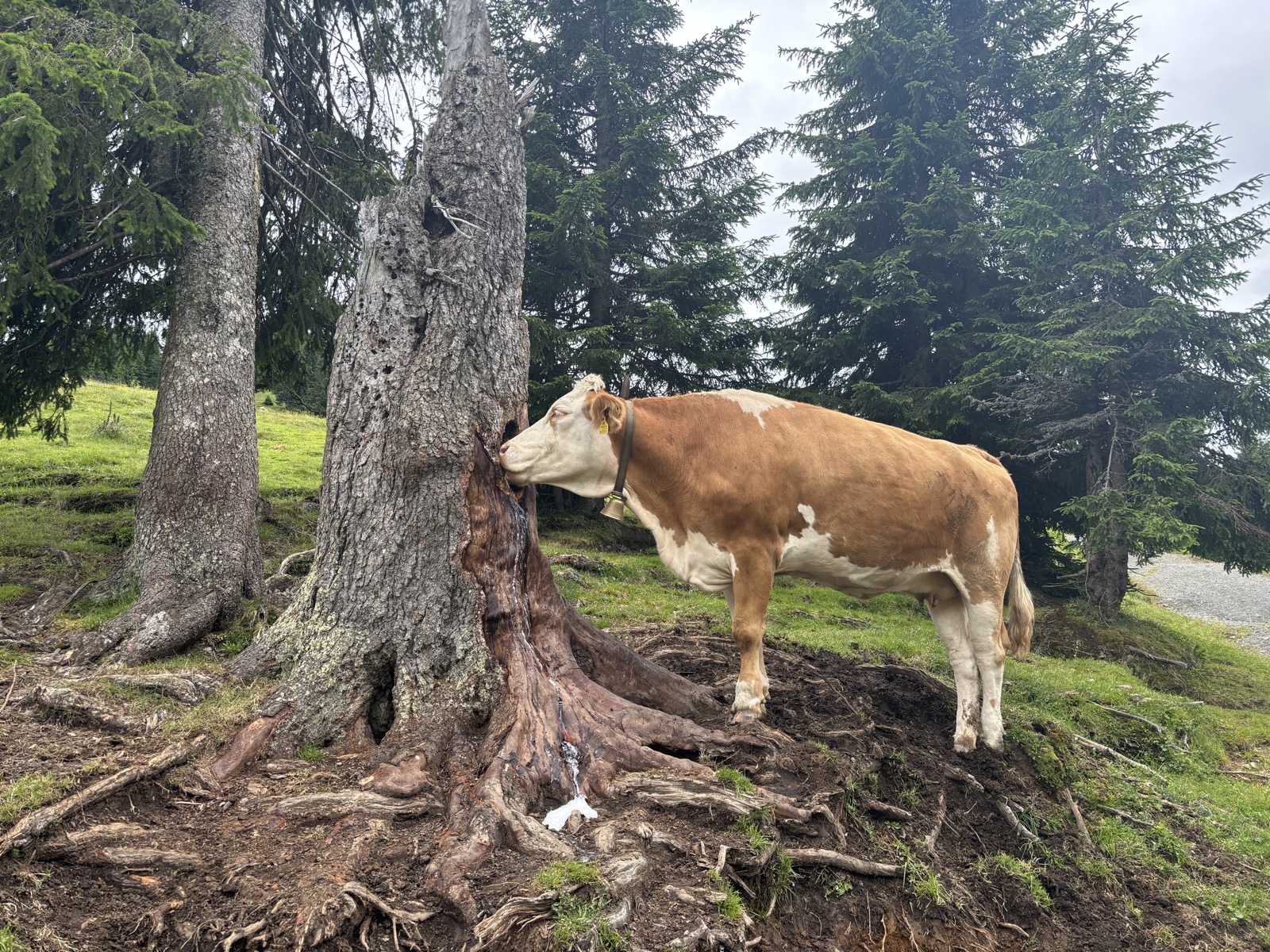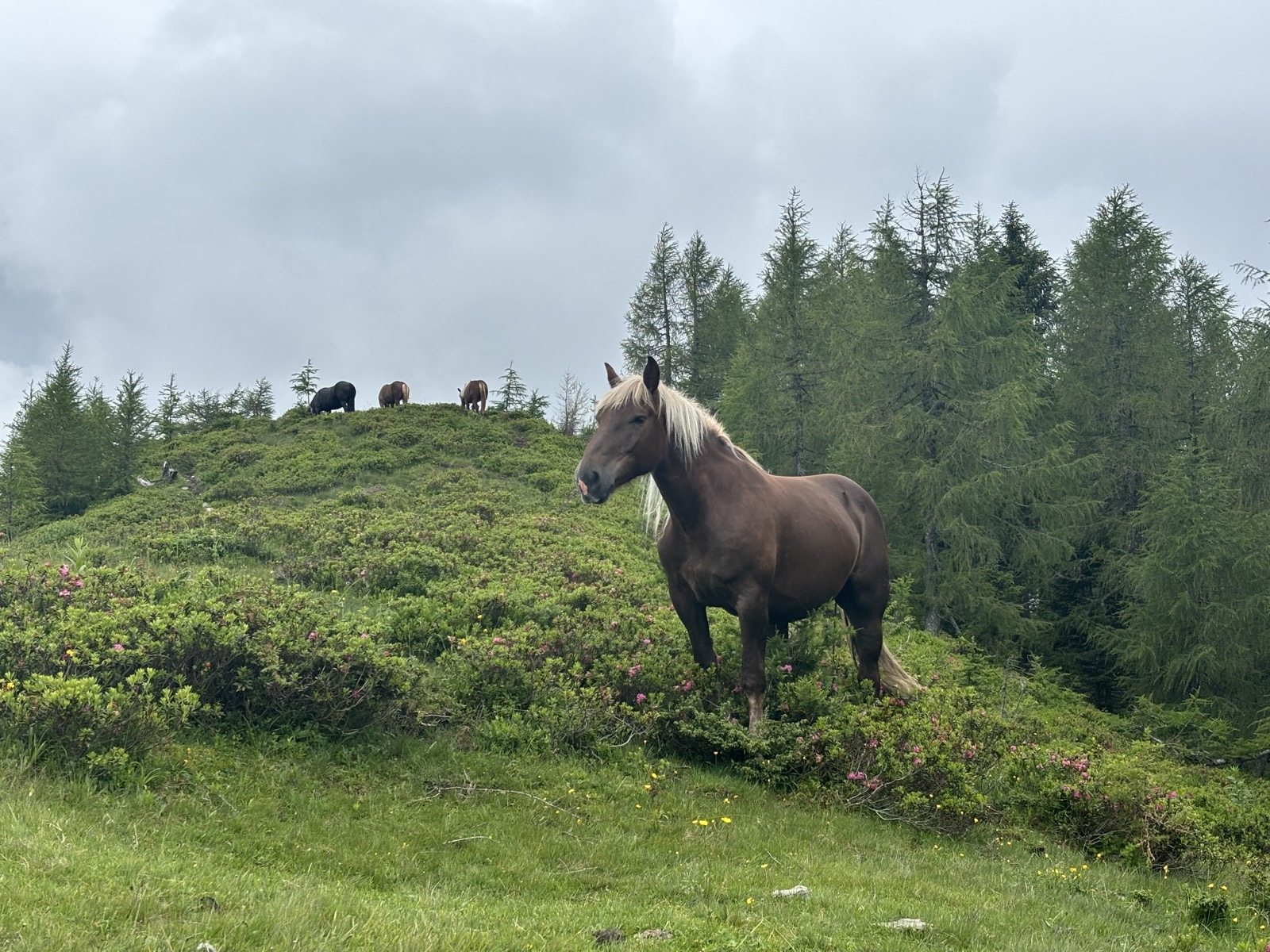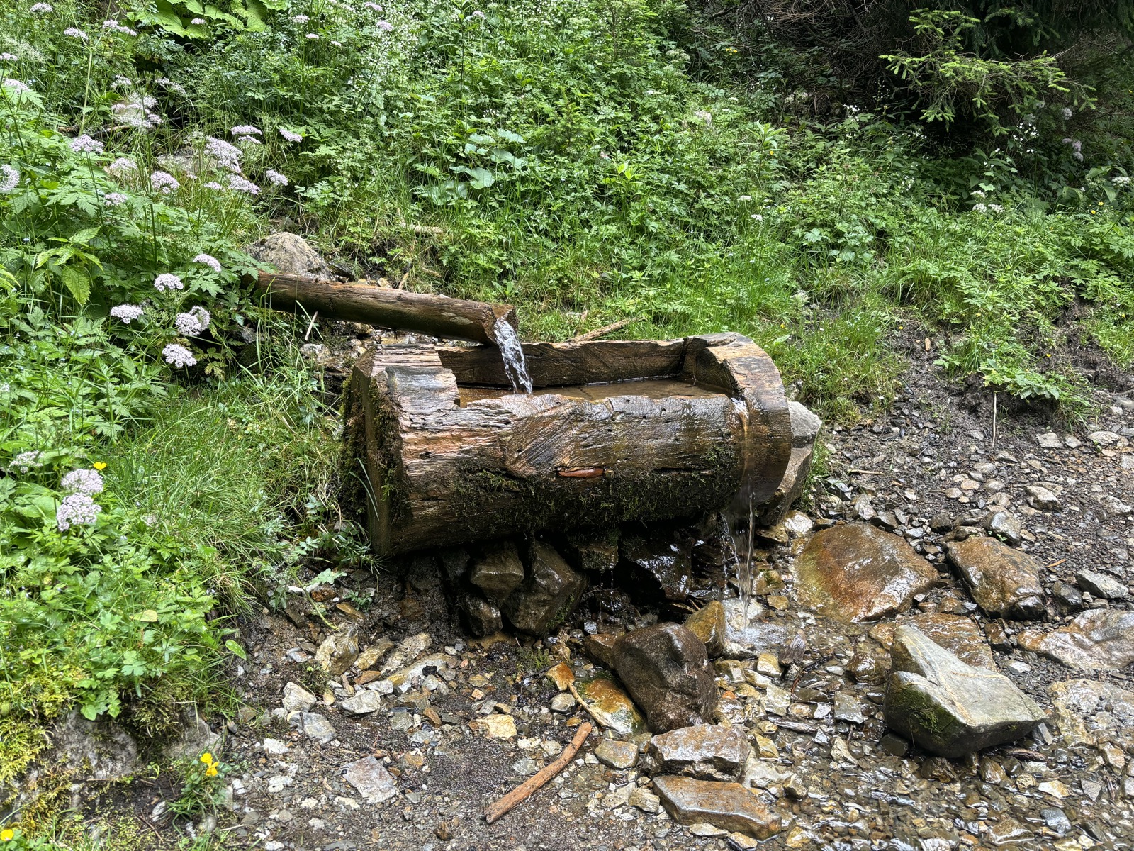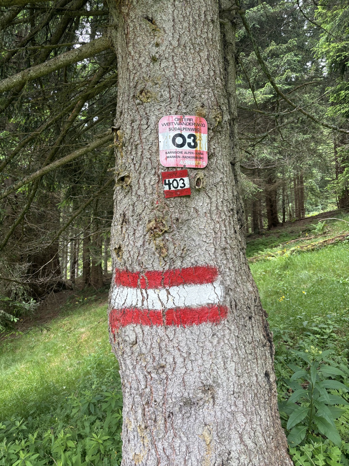 V 7:50 přijde odbočka z cesty na zarostlou cestičku. Je pořád velmi mokro. Vede to pak dál do lesa a dolů a pak na dně přes potok a opět nahoru. Prve po cestičce a pak zase štěrková cesta k dalšímu almu. Pak pokračuju dál vzhůru až na hřeben.